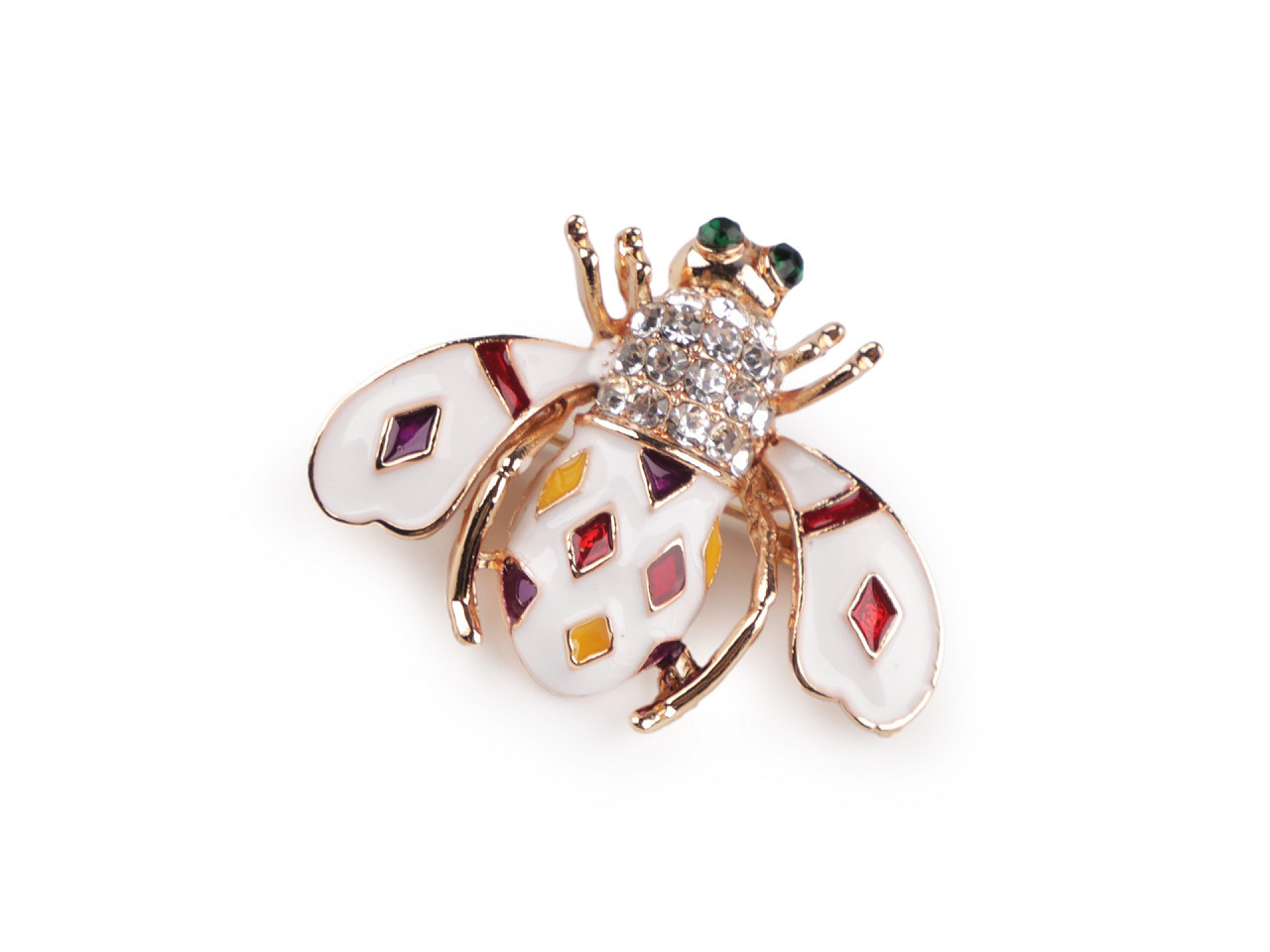 Kovová brož včela si vás získá svým netradičním designem. Veselý barevný základ je doplněný broušenými kamínky. Působivě vám zkrášlí oděvy i doplňky (tašky, klobouky, šátky.).
