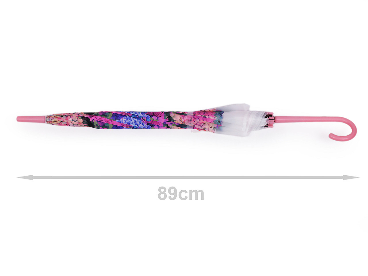 Průsvitný deštník s potiskem hortenzií je vystřelovací, konstrukci má z kovového drátu a pružných lamel, které tvoří osm polí. Díky nim je velice pevný, neohne se ani za největšího nečasu. Klasická tyč je zakončená pevnou rukojetí.