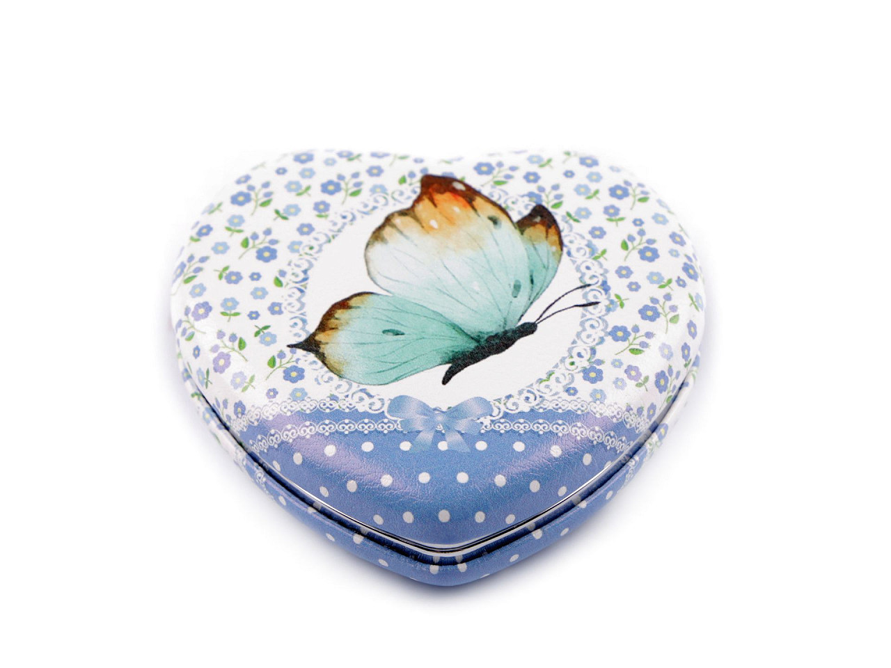 Otevírací zrcátko ve tvaru srdce s dekorem motýla je výborný pomocník pro opravu make-upu během dne. Skvěle se vejde do každé kabelky. Má kvalitní zpracování, je potažené eko kůží. Uvnitř jsou 2 zrcátka, jedno je zvětšovací. Potisk je na horní i dolní straně.