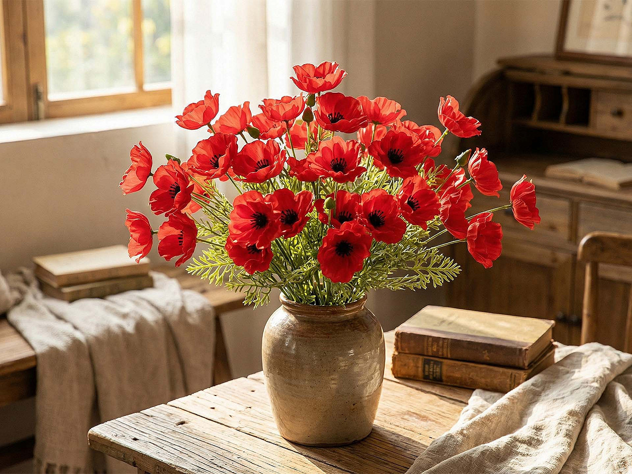 Umělý vlčí mák – realistická dekorace s 4 květy. Dodajte svému interiéru šmrnc s elegantním umělým vlčím mákem, který nikdy nezvadne. Tento detailně zpracovaný květ vynikne samostatně ve váze, ale skvěle se hodí i do věnců, květinových aranžmá nebo ikeban. Díky své všestrannosti se stane ideální ozdobou pro váš domov, kancelář či jakýkoli prostor, který chcete oživit barevným akcentem. Na pevném stonku najdete čtyři krásné květy, které působí přirozeně a dodají dekoraci realistický vzhled.