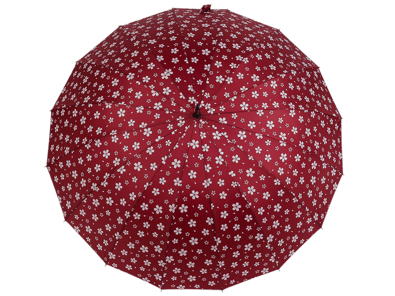 Dámský vystřelovací deštník s malými květy vás spolehlivě ochrání před nepřízní počasí. Skládá se z 16 výsečí, díky kterým se deštník řadí mezi luxusní kousky. Konstrukce je vyrobená z kovových drátů a pružných lamel zajišťujících vysokou pevnost a stabilitu, deštník se neohne ani za největšího nečasu. Má klasickou tyč zakončenou pevnou rukojetí.
