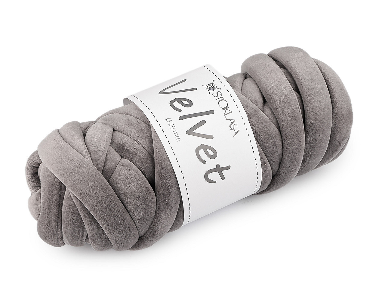 Silná příze Velvet je objemná, měkká a velmi příjemná na dotek. Tvoří ji tunýlek vyplněný vláknem. Dobře se vám s ní bude pracovat velkými jehlicemi nebo rukama.