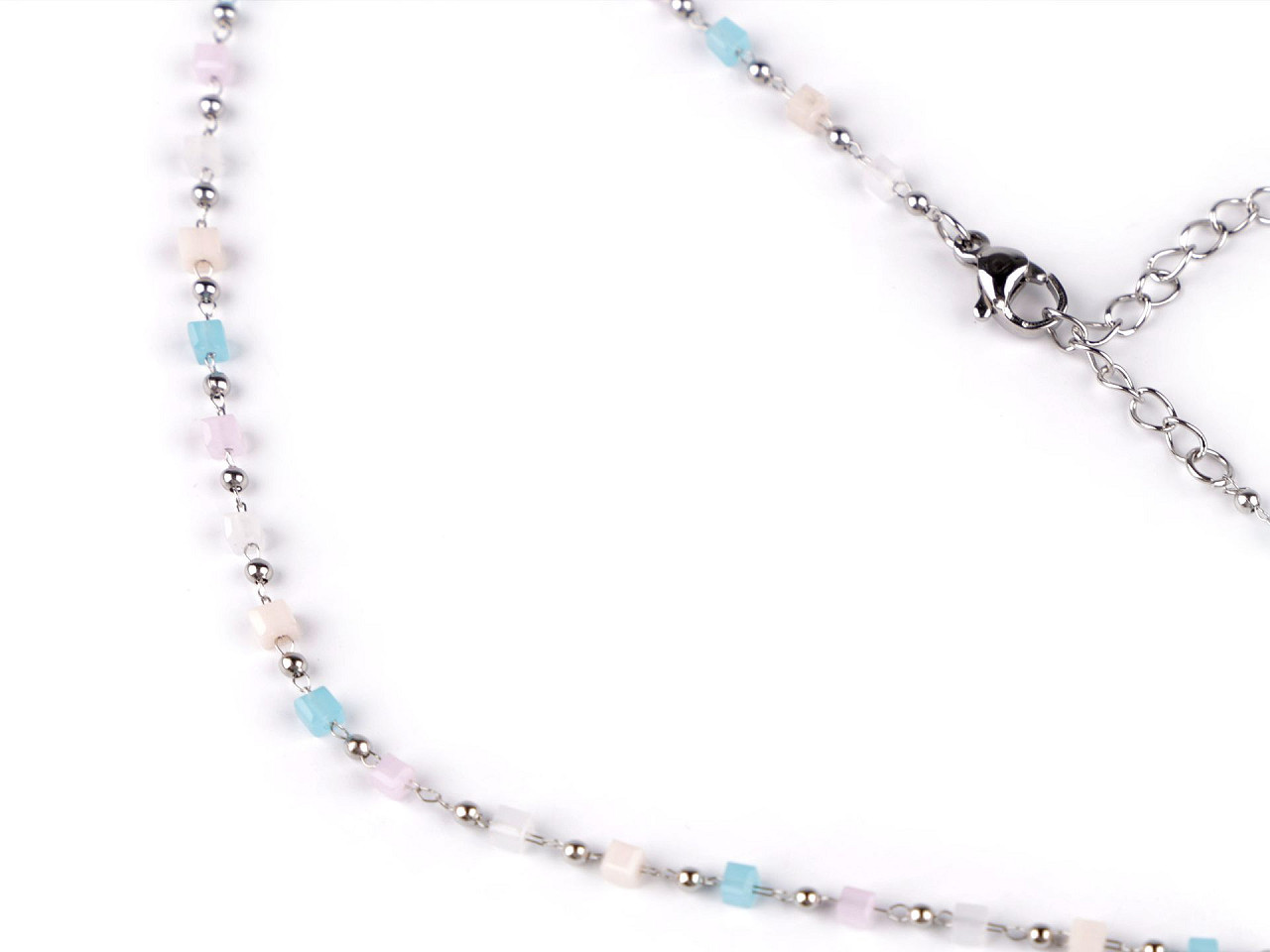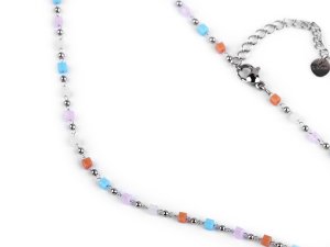 Jemný ketlovaný náhrdelník je vyrobený z kvalitní nerezové oceli. Je ozdobený broušenými korálky ve tvaru kostiček. Broušené korálky se jemně lesknou, náhrdelník se hodí k slavnostním šatům i na běžné nošení, má velice všestranné využití.