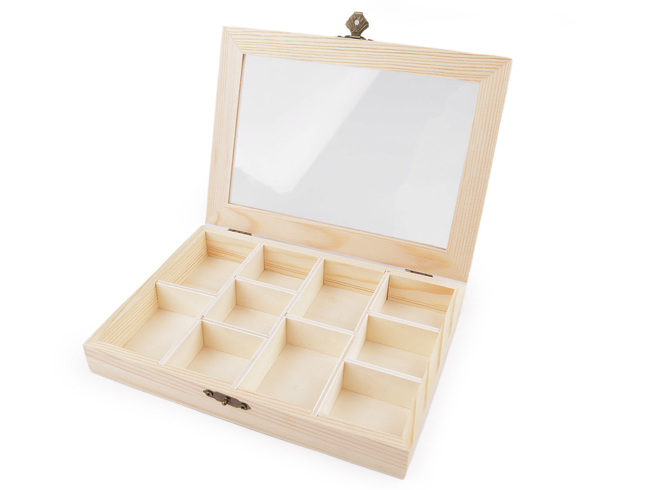 Dřevěná krabička s průhledným skleněným víkem se hodí na uložení drobného materiálu na vaše kreativní tvoření. Víko je odklápěcí, s kovovým zapínáním a panty. Hodí se na korálky, knoflíky, bižuterní materiál apod. Najde využití i jako stylový organizér v domácnosti, do skříně, šuplíku apod. Vejdou se do ní náramky, gumičky, sponky apod. Je oblíbená i sběrateli drahých kamenů a minerálů.