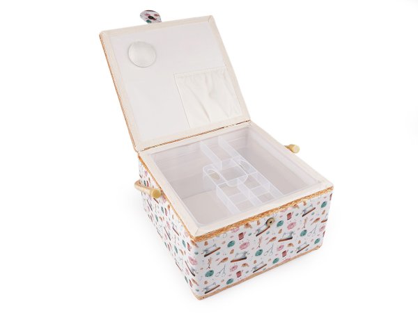 Větší čalouněný košík na šicí potřeby ocení všechny švadleny. Na vnitřní straně víka má košík jehelníček a kapsu. Dále je k dispozici plastové mezipatro se spoustou přihrádek, do kterých si lze šicí potřeby uspořádat. Patro se dá snadno vyjmout. Výška mezipatra je 3 cm. Košík má zapínání na magnet. Díky kvalitnímu pevnému uchu jej můžete snadno přenést.