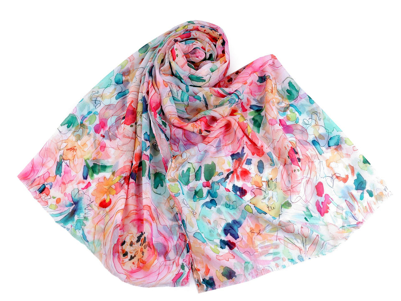 Šátek s barevným vzorem je lehounký a vzdušný, velice příjemný na dotek. Je jemně průsvitný, na koncích má jemné třásně. Doladí váš outfit, ať už si vezmete sako, halenku, svetřík či šaty.