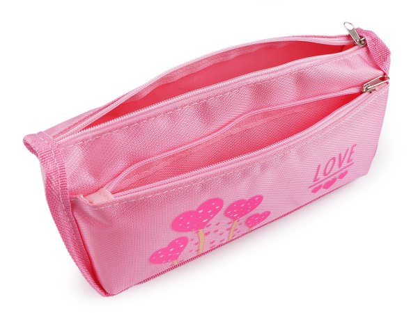 Textilní pouzdro schová vše potřebné, co školáci potřebují. Na přední straně je ozdobené potiskem. Má velkou kapsu na psací potřeby a malou kapsičku na drobnosti. Obě se uzavírají na zip.