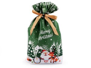 Velké stahovací sáčky s vánočními motivy se skvěle hodí nejen na balení dárků, ale i dobrot (bonbónů, oříšků, sušeného ovoce apod.). Stahují se pomocí saténové stuhy.