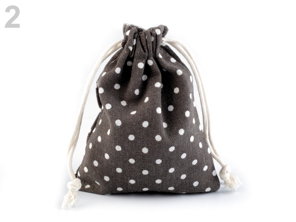Pytlík je vyrobený z kvalitního a pevného materiálu. Snadno se uzavírá pomocí dvou bavlněných stahovacích šňůrek. Má veselý puntíkovaný design.