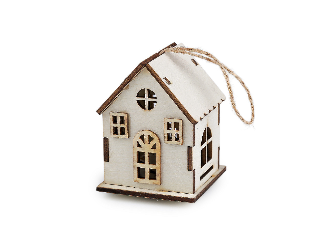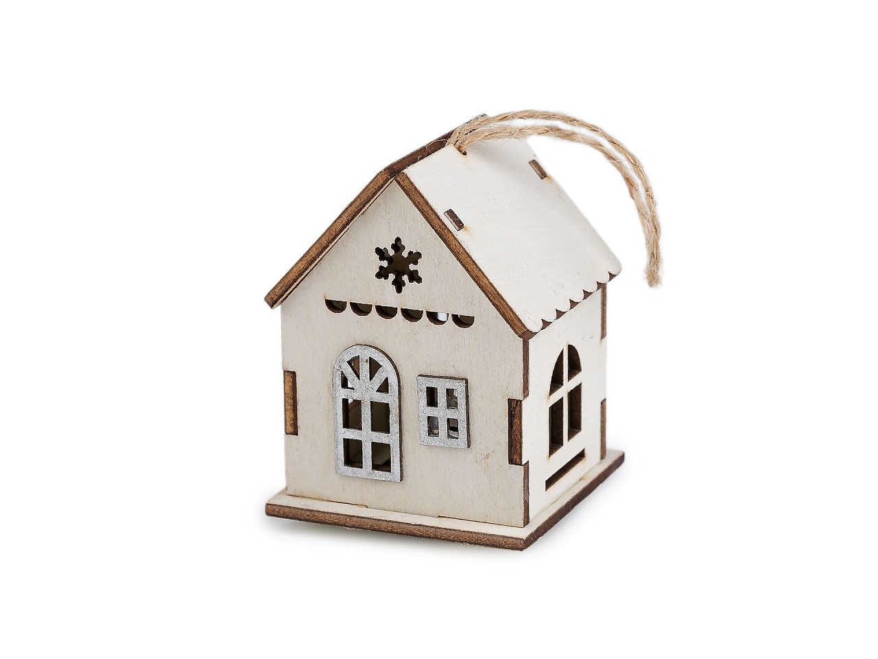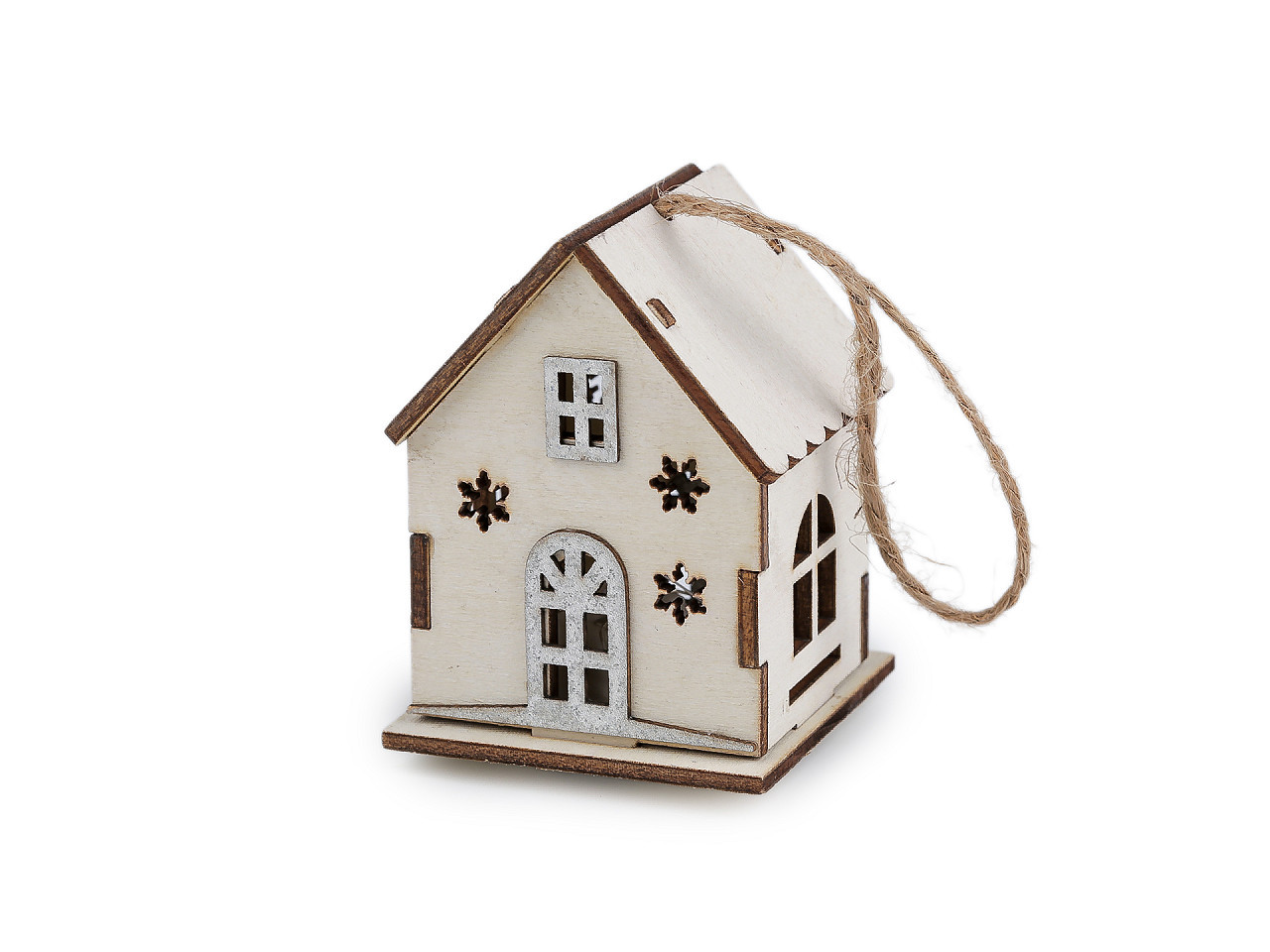 Dřevěný svítící domeček má poutavě zpracované výřezy a svítí studeným světlem. Díky glitrům se působivě třpytí. Za jutové poutko ho můžete pověsit na stromeček, věnce apod.