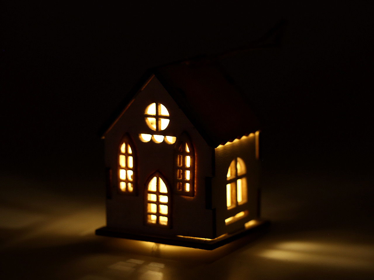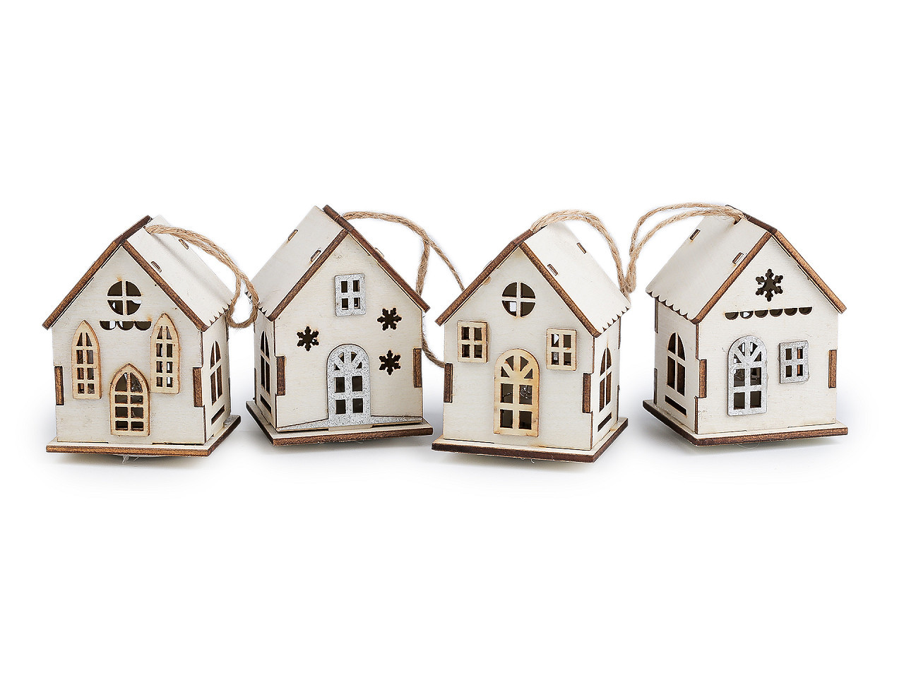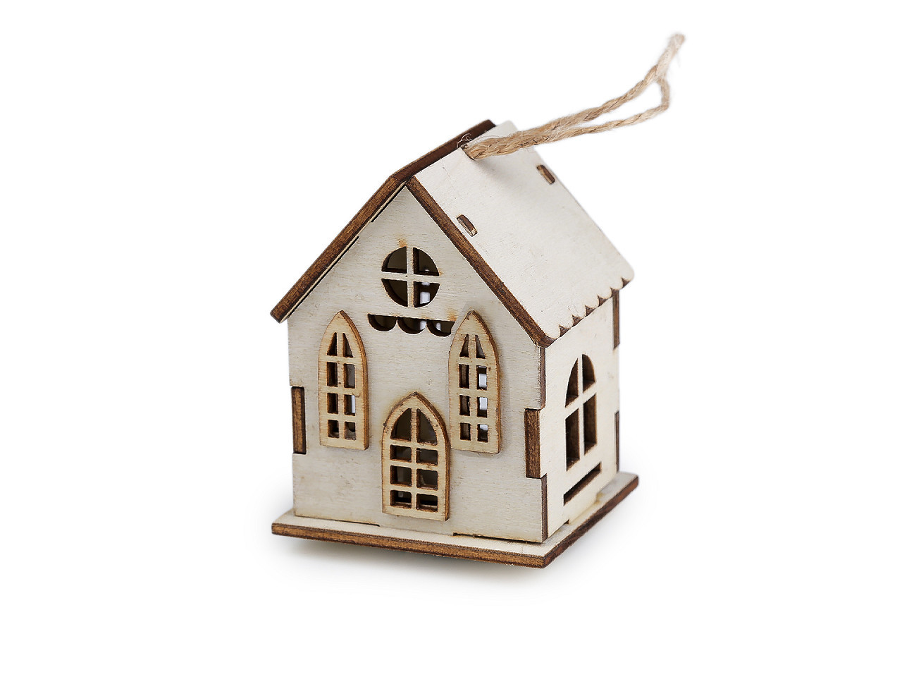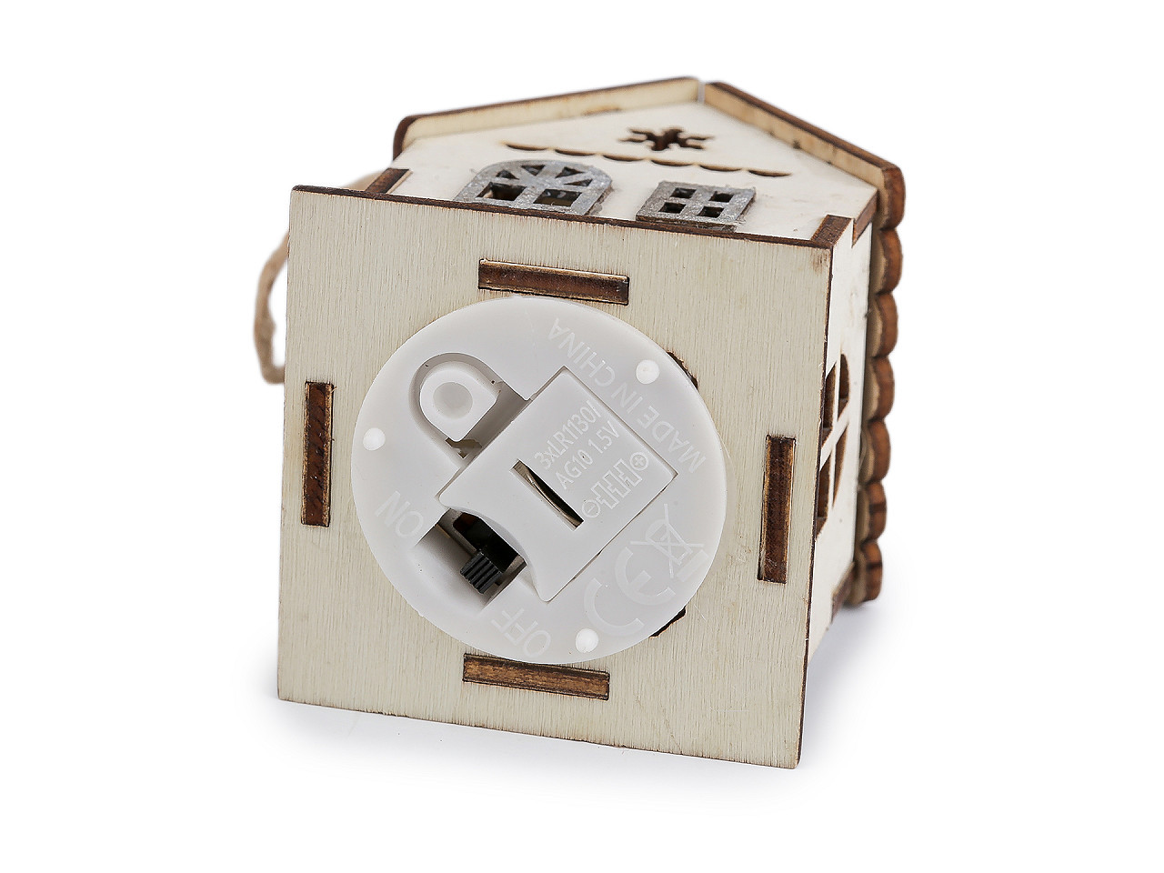 Dřevěný svítící domeček má poutavě zpracované výřezy a svítí studeným světlem. Díky glitrům se působivě třpytí. Za jutové poutko ho můžete pověsit na stromeček, věnce apod.