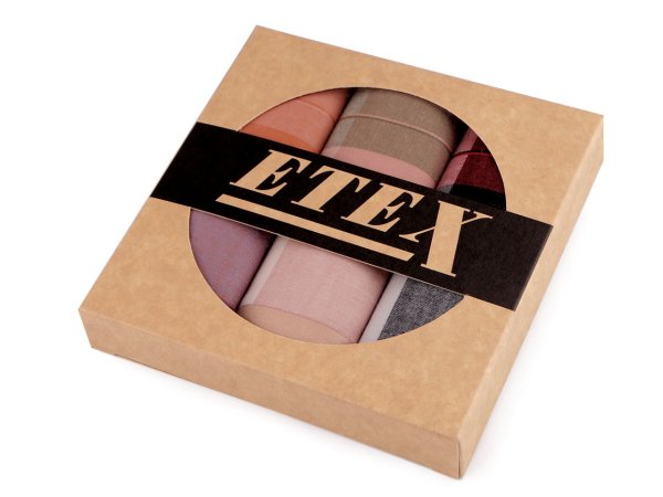 Kapesníky jsou zabalené v dárkové krabičce přírodního vzhledu s kulatým průhledem.