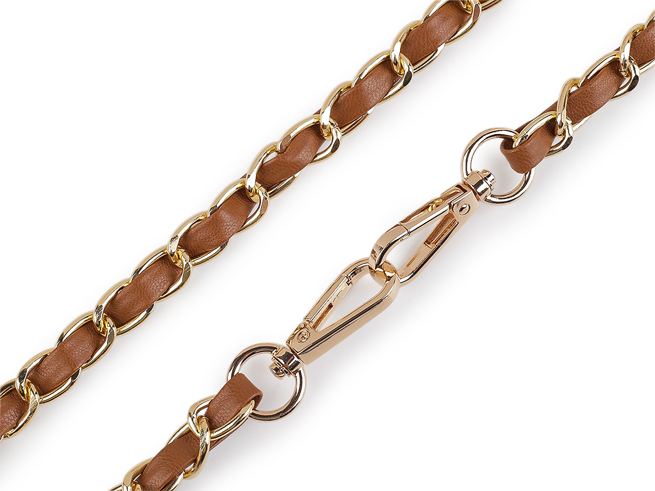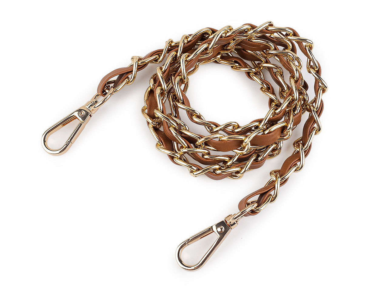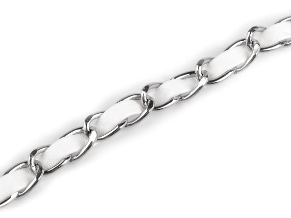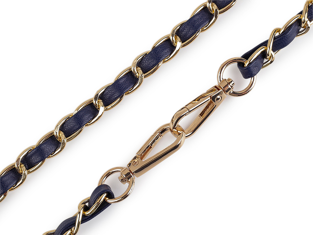 Kovový řetízek je efektně propletený řemínkem z eko kůže. Využijete ho na menší kabelky, psaníčka nebo pouzdra na mobilní telefony. Na obou jeho koncích najdete připevněné karabinky.