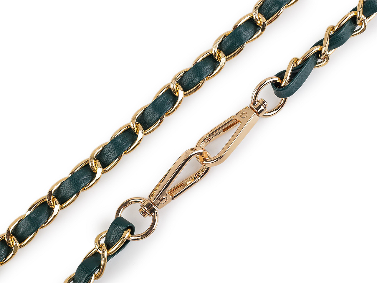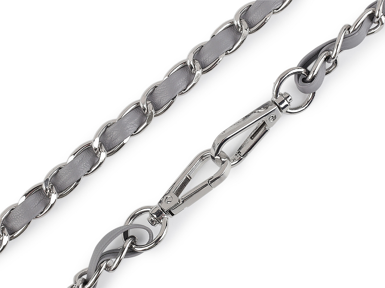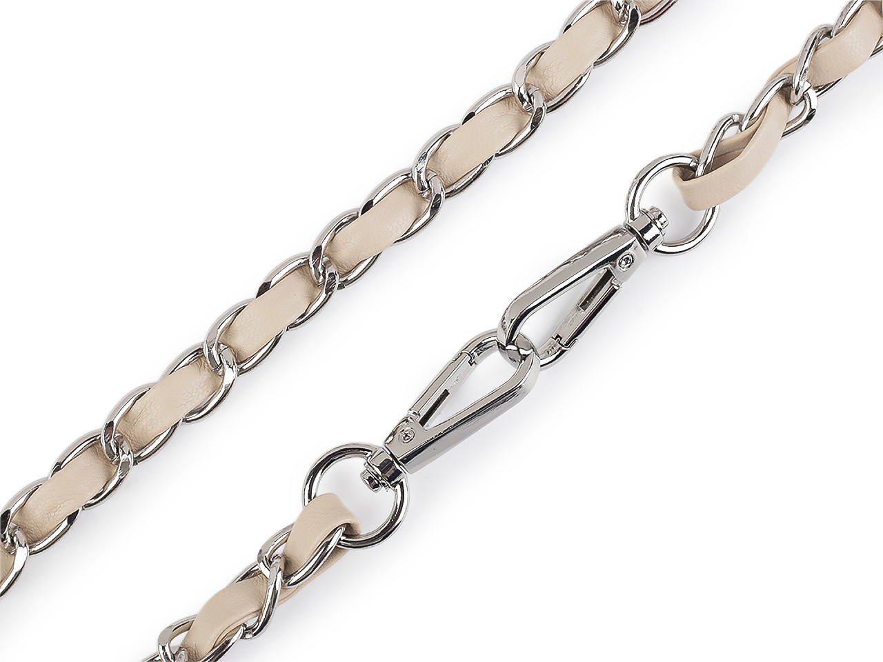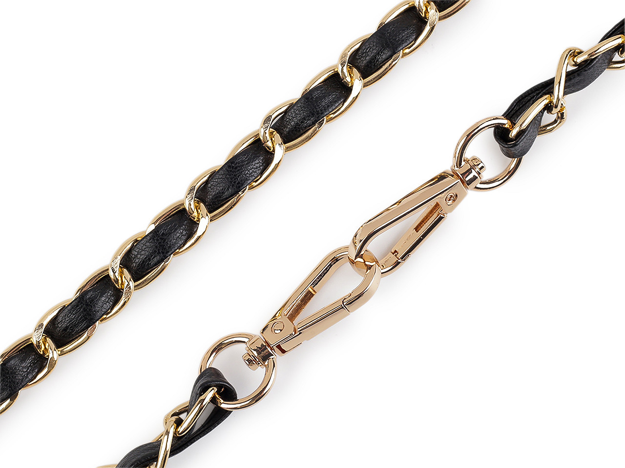 Kovový řetízek je efektně propletený řemínkem z eko kůže. Využijete ho na menší kabelky, psaníčka nebo pouzdra na mobilní telefony. Na obou jeho koncích najdete připevněné karabinky.