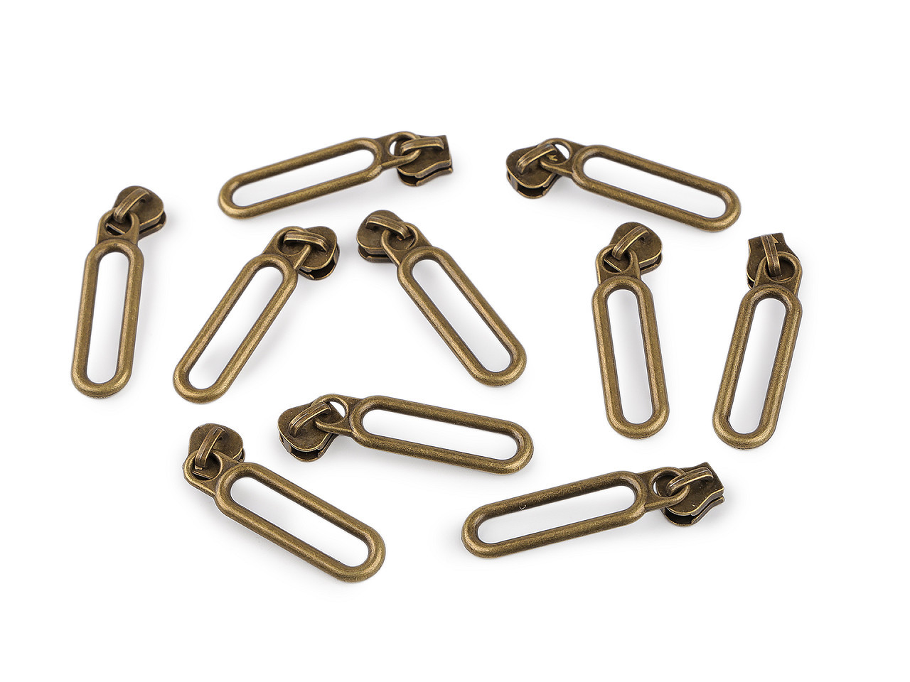 Kovový jezdec s velkým ozdobným taháčkem je určený ke kostěným zipům v metráži, které u nás najdete pod kódy 104655, 106131118170, 125813.