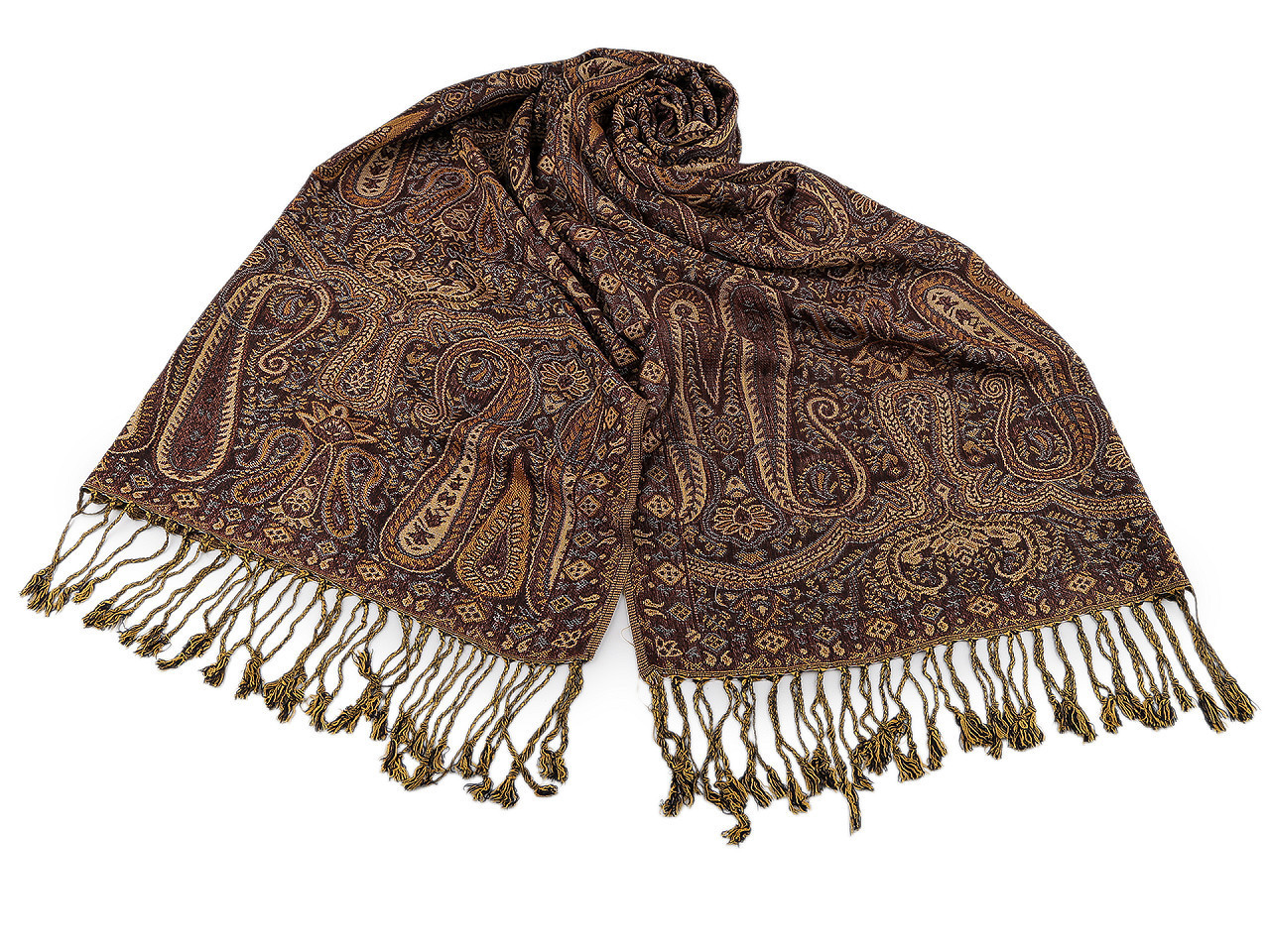 Elegantní šátek s orientálním vzorem vás okouzlí na pohled i dotek. Je oboustranný, jedna strana je tmavá, druhá světlá. Šátek je příjemně hebký, oceníte jej celoročně na každý den. Můžete jej nosit do práce i do společnosti, jeho elegantní vzhled váš outfit dokonale dozdobí. Vzor na šátku vznikl tkaním díky preciznímu křížení barevných vláken. Konce šátku jsou ozdobené třásněmi.