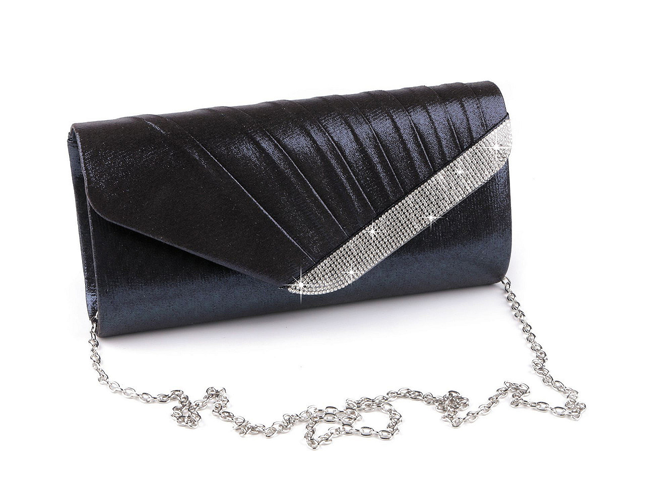 Psaníčko ozdobené broušenými kamínky je elegantním doplňkem na různé slavnostní události. Luxusní vzhled a třpyt této kabelky přitáhne pozornost širokého okolí. Psaníčko má textilní potah, na přední straně je nařasené. Je pevné, vyztužené, uvnitř má polyesterovou podšívku a malou kapsičku na drobnosti. Zapíná se na magnet. Ke kabelce patří odepínatelný řetízek. Psaníčko můžete nosit s řetízkem přes rameno nebo bez něj jen tak v ruce.