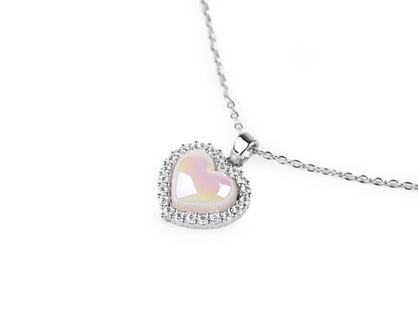 Řetízkový náhrdelník s přívěskem srdce je vyrobený z kvalitní nerezové oceli. Srdce má nádherný perleťový lesk, dokola je osázené třpytivými broušenými kamínky. Je zavěšené na šlupně, volně se na řetízku pohybuje. Náhrdelník decentně dozdobí většinu outfitů. Bude nádherným dárkem pro blízkou osobu nebo na Valentýna.