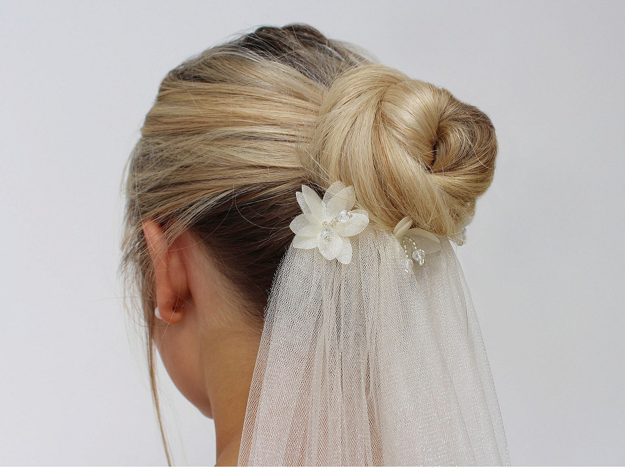 Elegantní květ se zdobeným středem je složený ze 2 vrstev tužšího monofilu s jemným perleťovým leskem. Střed je ručně dozdobený pestíky z broušených korálků a rokajlu, působí velice romanticky. Pestík ve středu květu dodává třpytivý efekt a zajišťuje bohatý a výrazný vzhled.