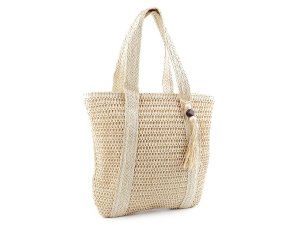 Velká háčkovaná kabelka s ozdobou střapce s dřevěnými korálky je zajímavým doplňkem v boho stylu. Je vyrobená z papírových provázků z palmy rafie, díky tomu je lehká jako peříčko. Decentní vzor háčkování vytváří nadčasový vzhled, který se hodí k různým příležitostem, bude krásným doplňkem vašeho letního outfitu. Uzavírá se na zip, uvnitř má dostatečně velký prostor i na větší věci. Má dvě ucha do ruky a uvnitř malou kapsičku na drobnosti.