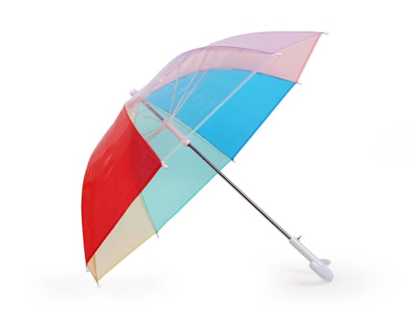 Dětský průhledný deštník s duhovým potahem má na rukojeti visačku, na kterou můžete napsat jméno dítěte. Má manuální otevírání a klasickou tyč zakončenou pevnou rukojetí. Konstrukce deštníku je z pružných lamel a tvoří osm polí. Lamely jsou zakončené plastovými koncovkami - zmenšují riziko poranění.