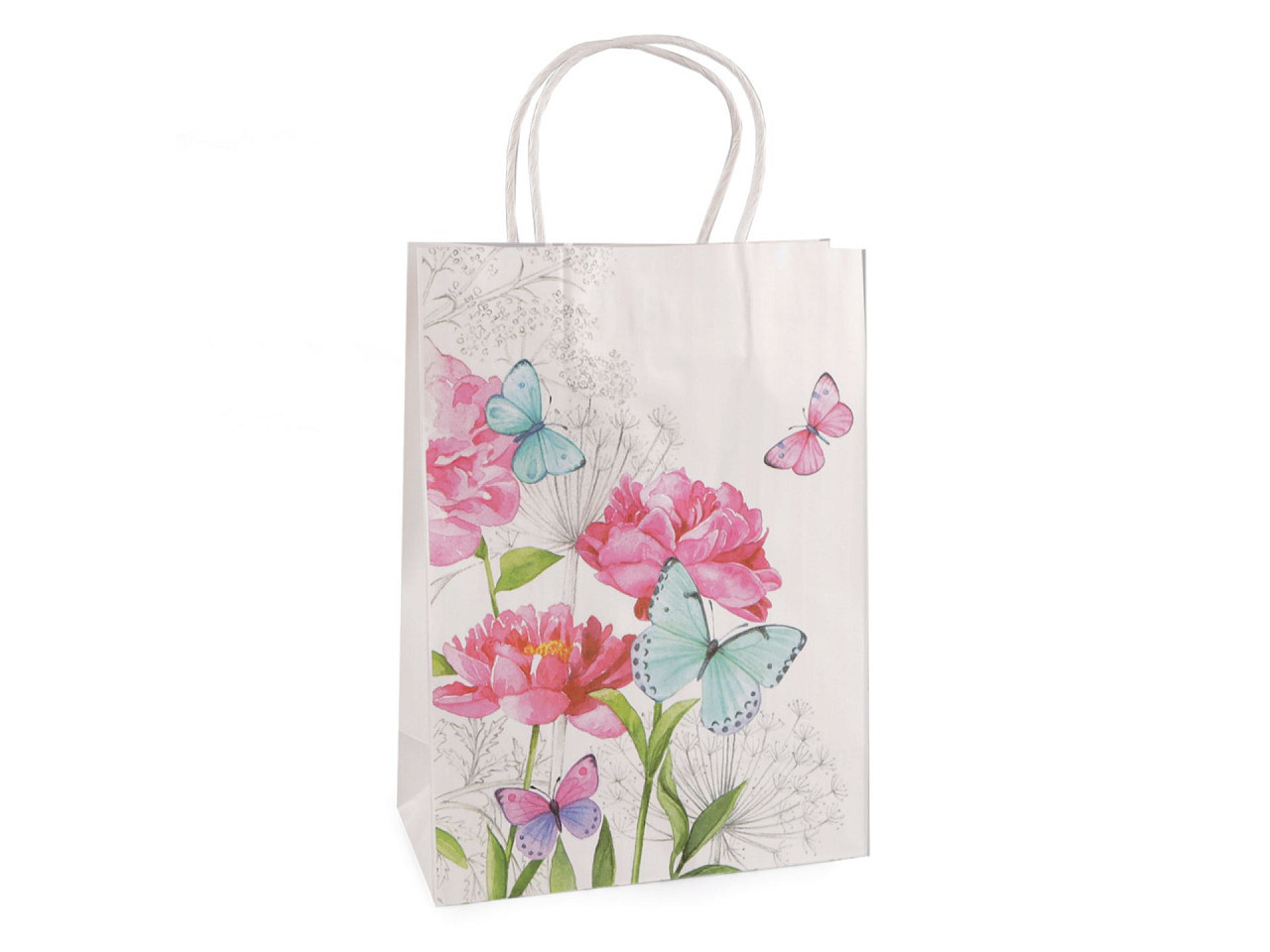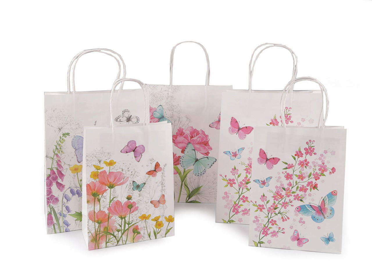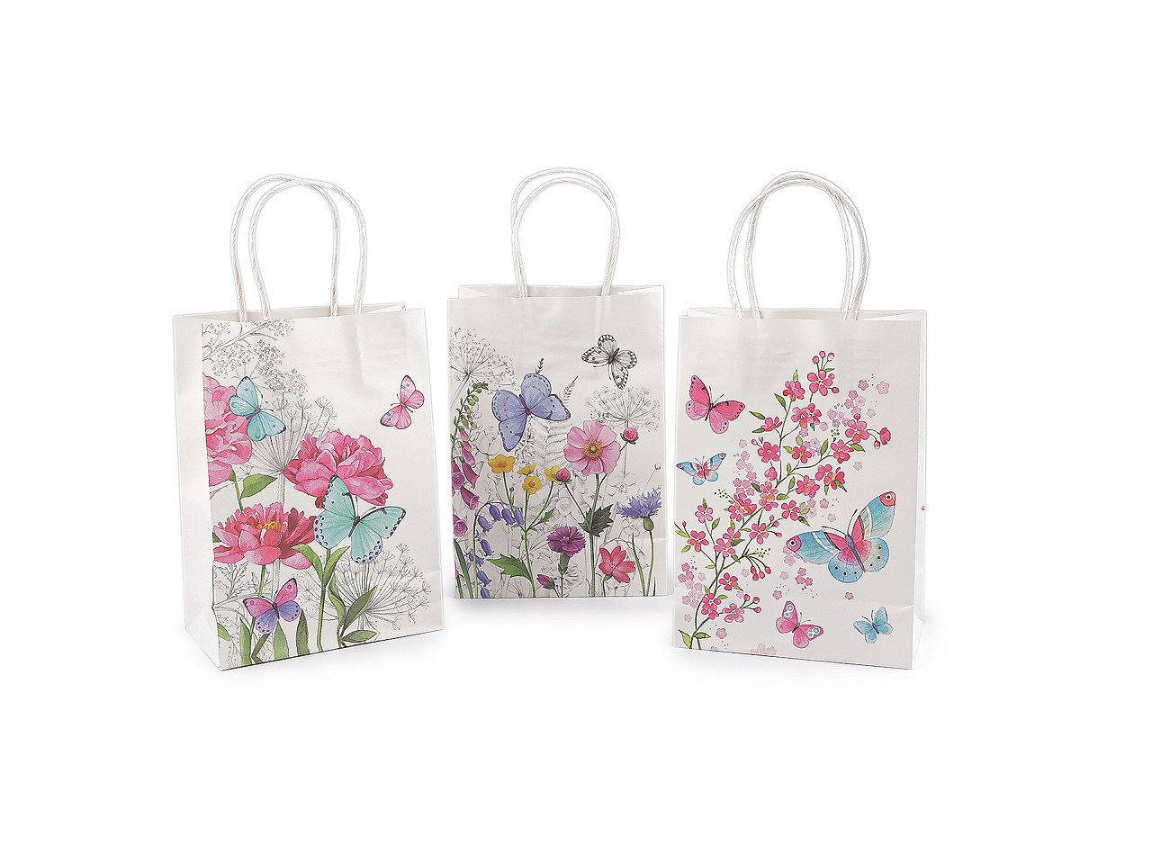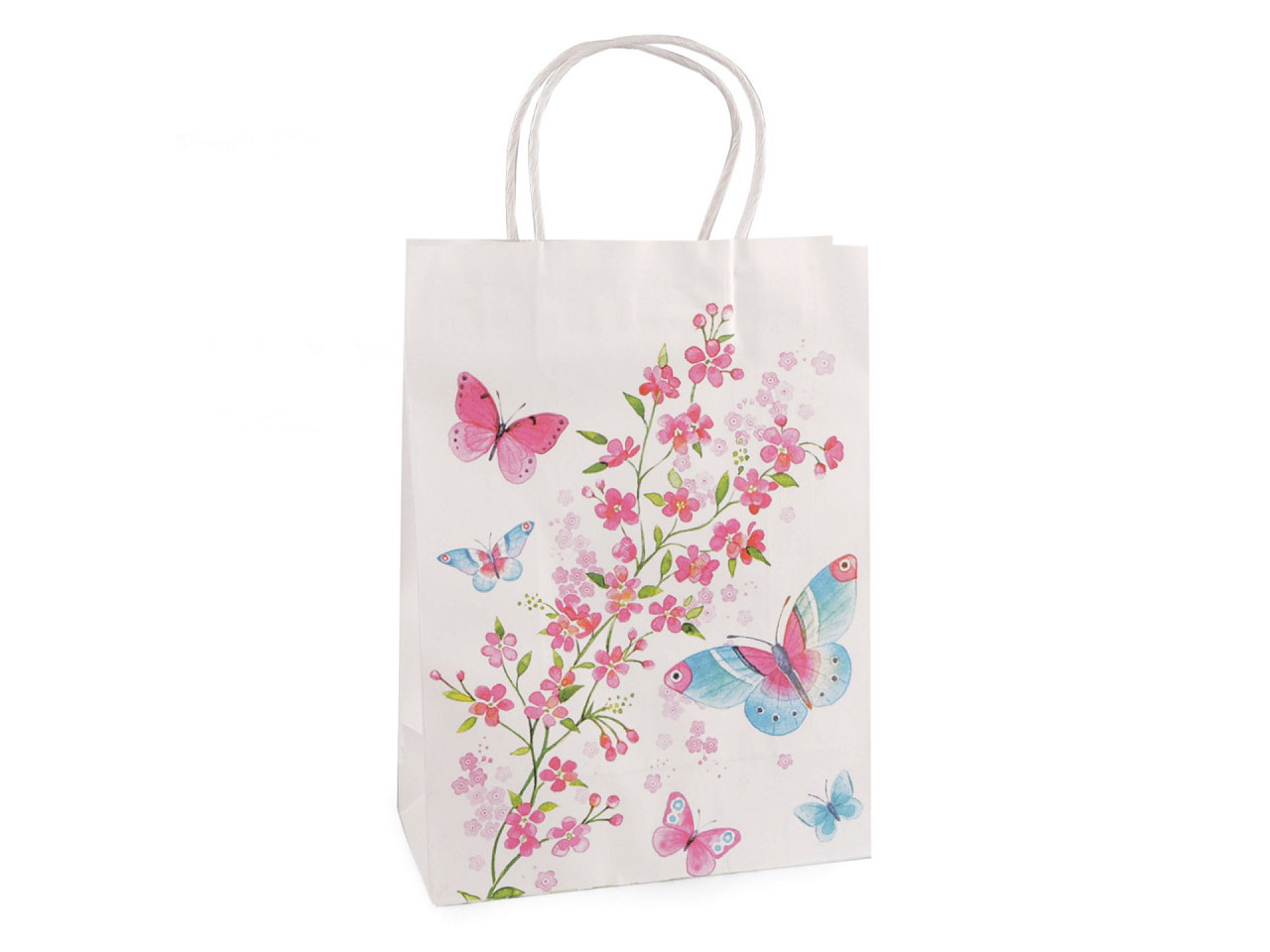 Papírová dárková taška s květinami a motýly – elegantní balení pro každou příležitost. Stylová papírová taška s jemným motivem květů a motýlů dodá vašemu dárku šmrnc a originalitu. Potisk na obou stranách působí romanticky a slavnostně, takže je ideální pro narozeniny, svatby, výročí či jiné významné události. Odolná kroucená papírová ucha zajišťují pohodlné nošení. Taška je vhodná nejen pro balení dárků, ale také pro elegantní prezentaci zboží v kamenných prodejnách.