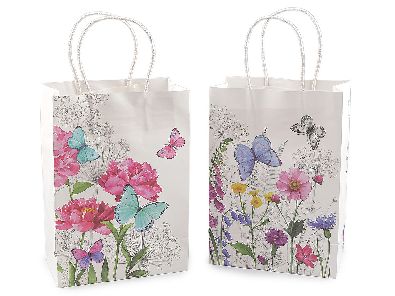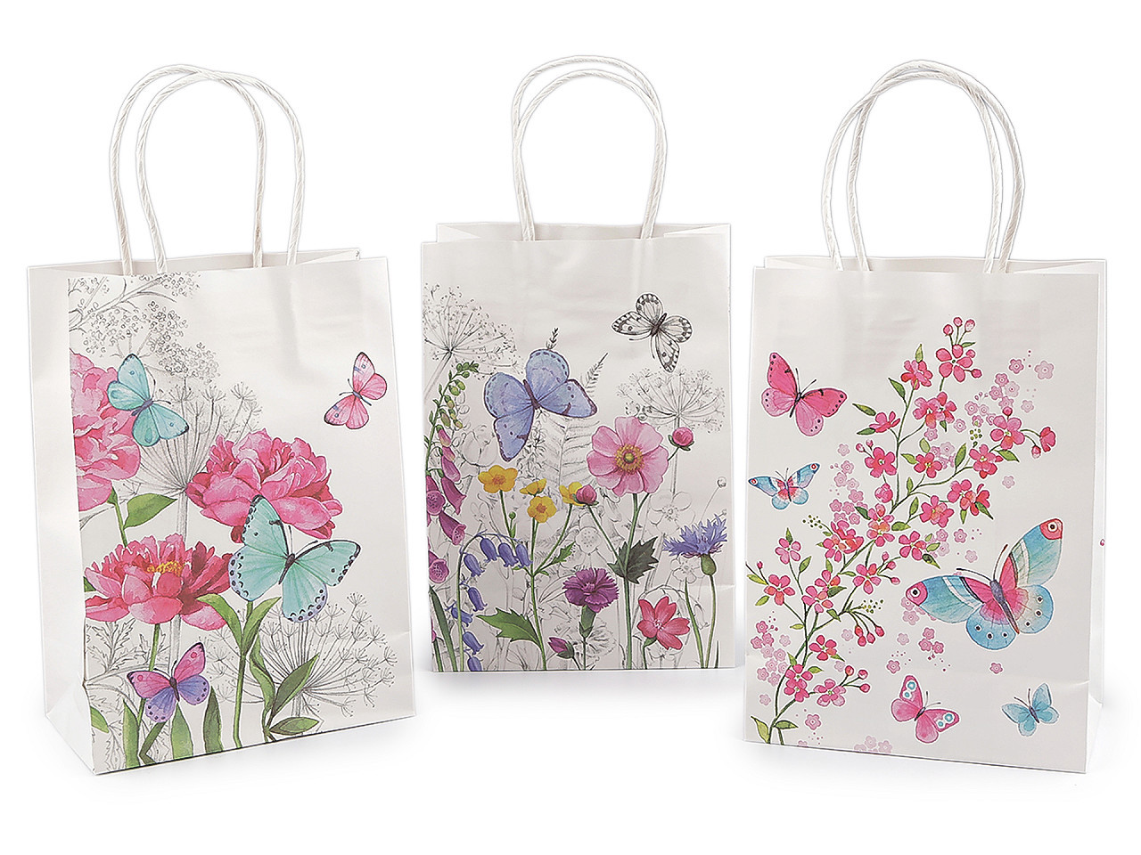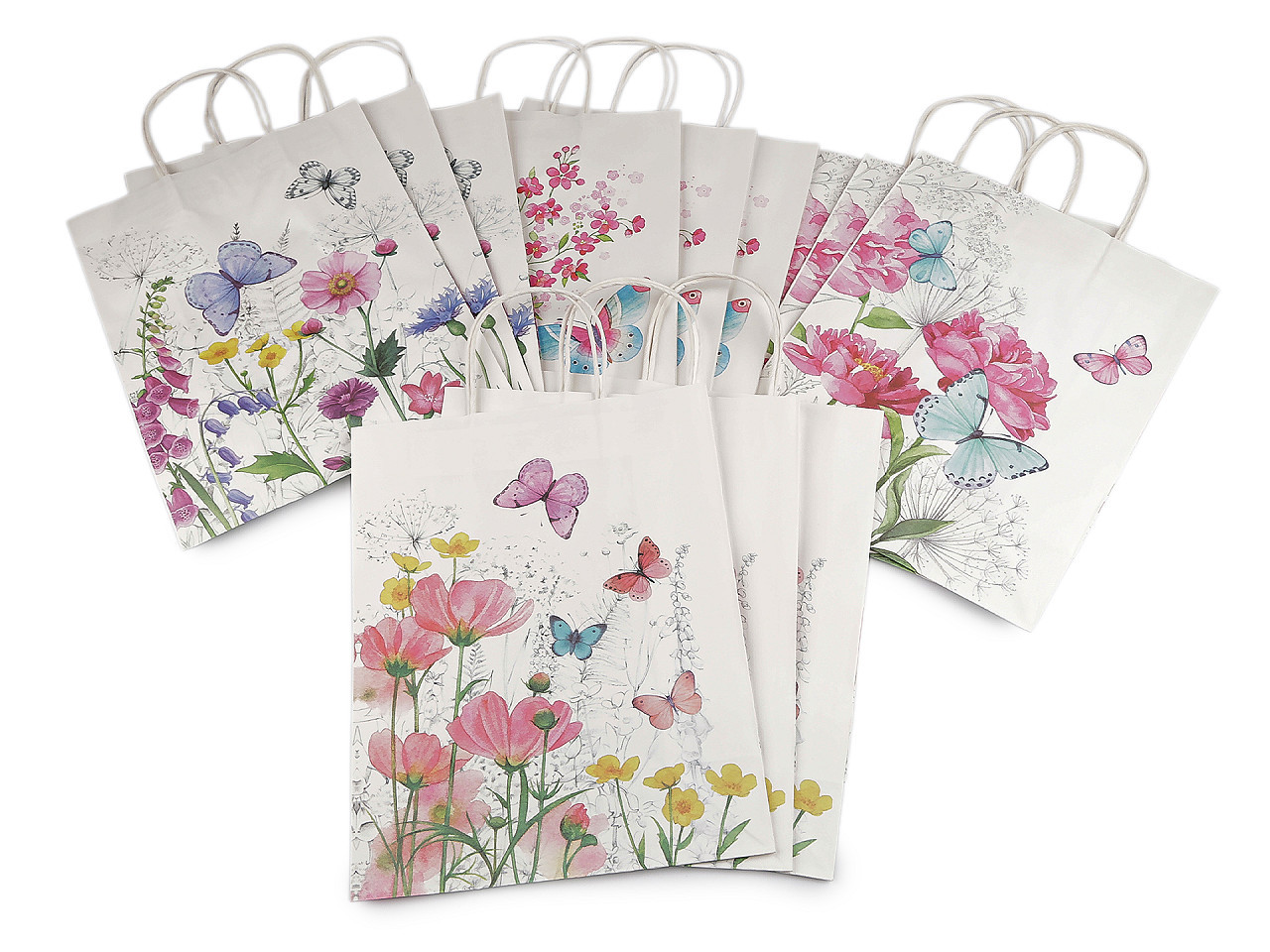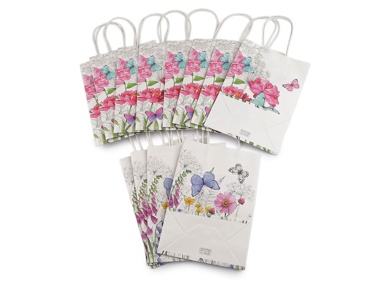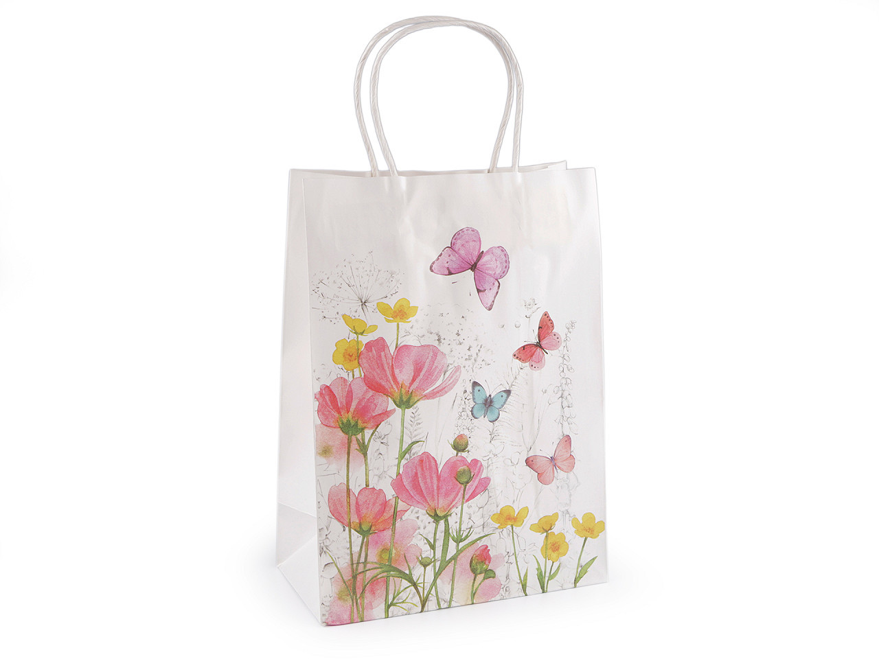 Papírová dárková taška s květinami a motýly – elegantní balení pro každou příležitost. Stylová papírová taška s jemným motivem květů a motýlů dodá vašemu dárku šmrnc a originalitu. Potisk na obou stranách působí romanticky a slavnostně, takže je ideální pro narozeniny, svatby, výročí či jiné významné události. Odolná kroucená papírová ucha zajišťují pohodlné nošení. Taška je vhodná nejen pro balení dárků, ale také pro elegantní prezentaci zboží v kamenných prodejnách.