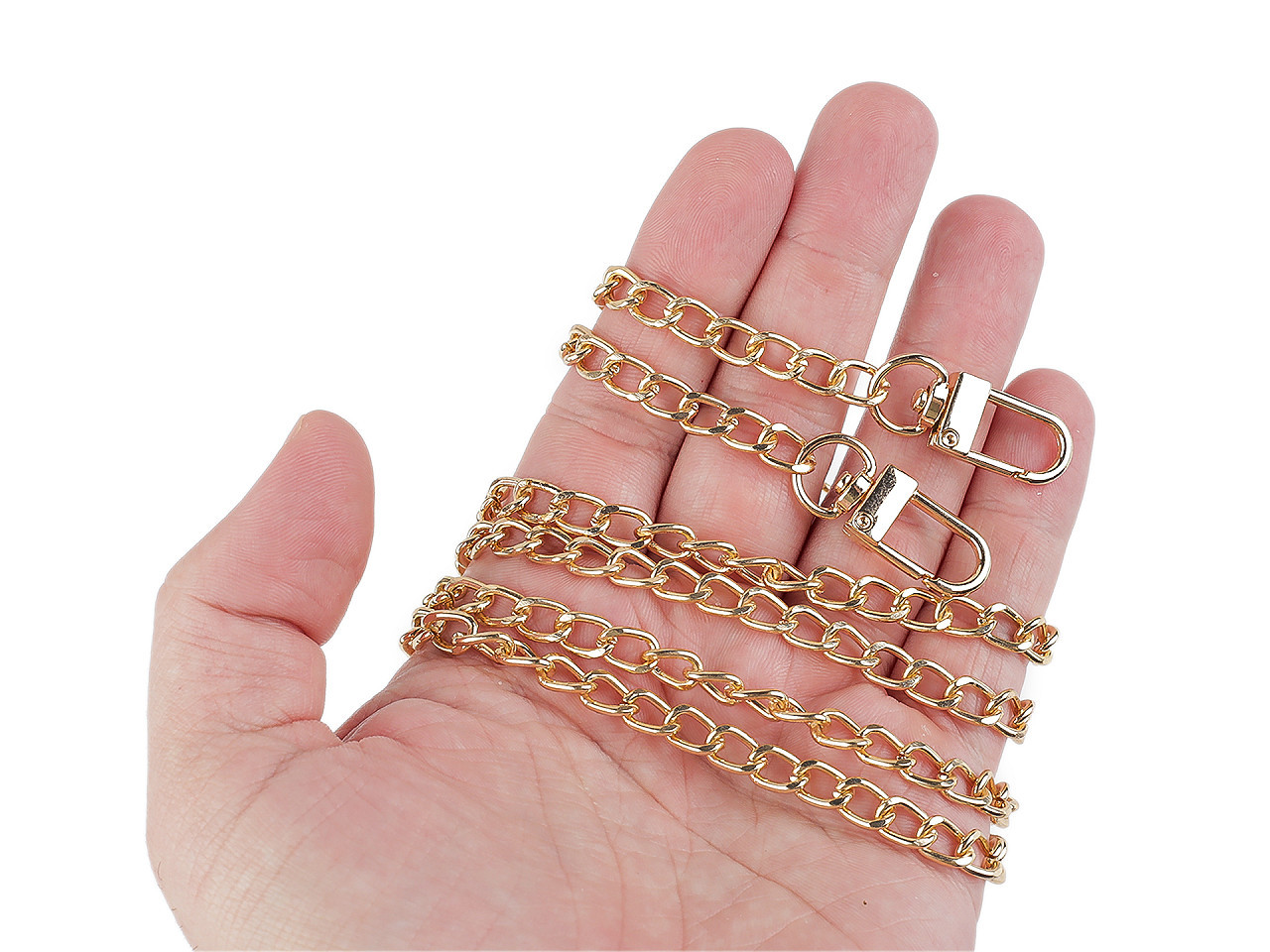 Řetízek s karabinkami na obou koncích využijete na kabelky a psaníčka. Karabinky umožňují jeho rychlé a jednoduché připevnění ke kabelce.
