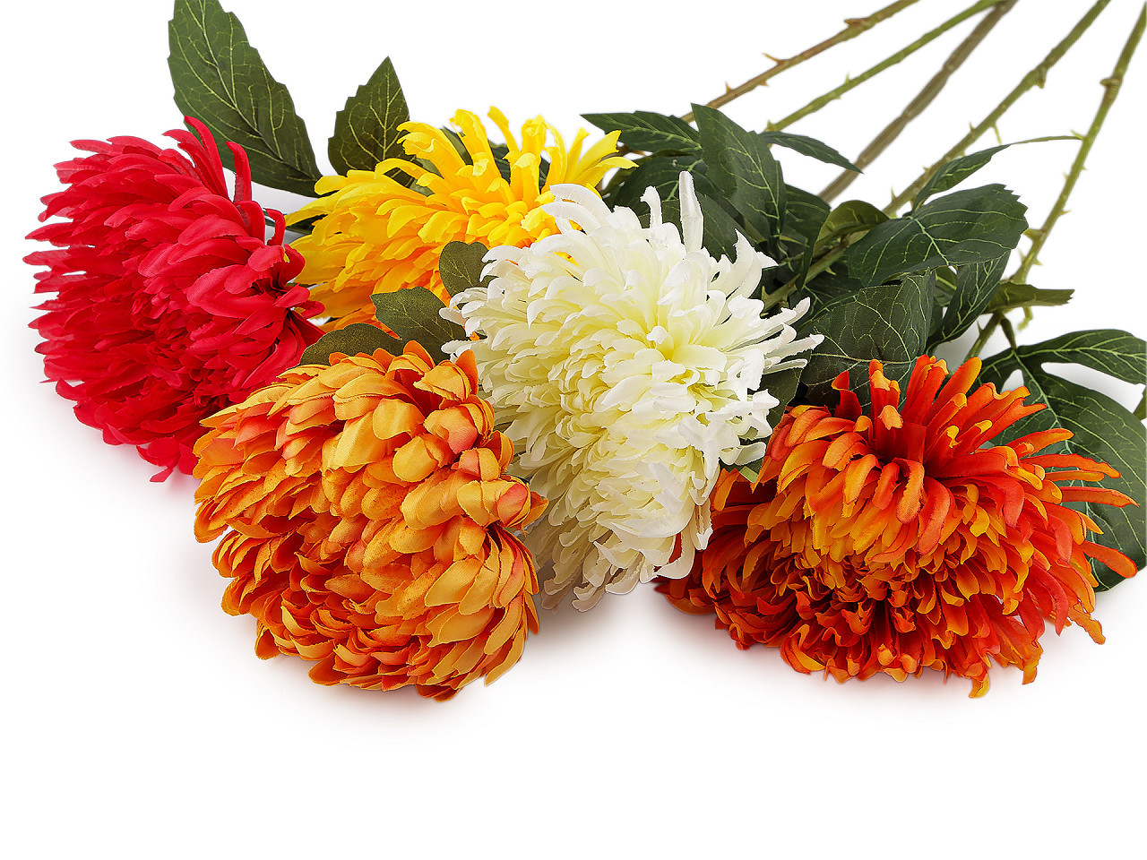 Umělá chryzantéma se pyšní svou velikostí. Květ a listy jsou textilní. Uvnitř stonku je drát. Chryzantémy vyniknou v jednoduché váze, ale také je využijete k aranžování květinových vazeb, věnců i ikeban.