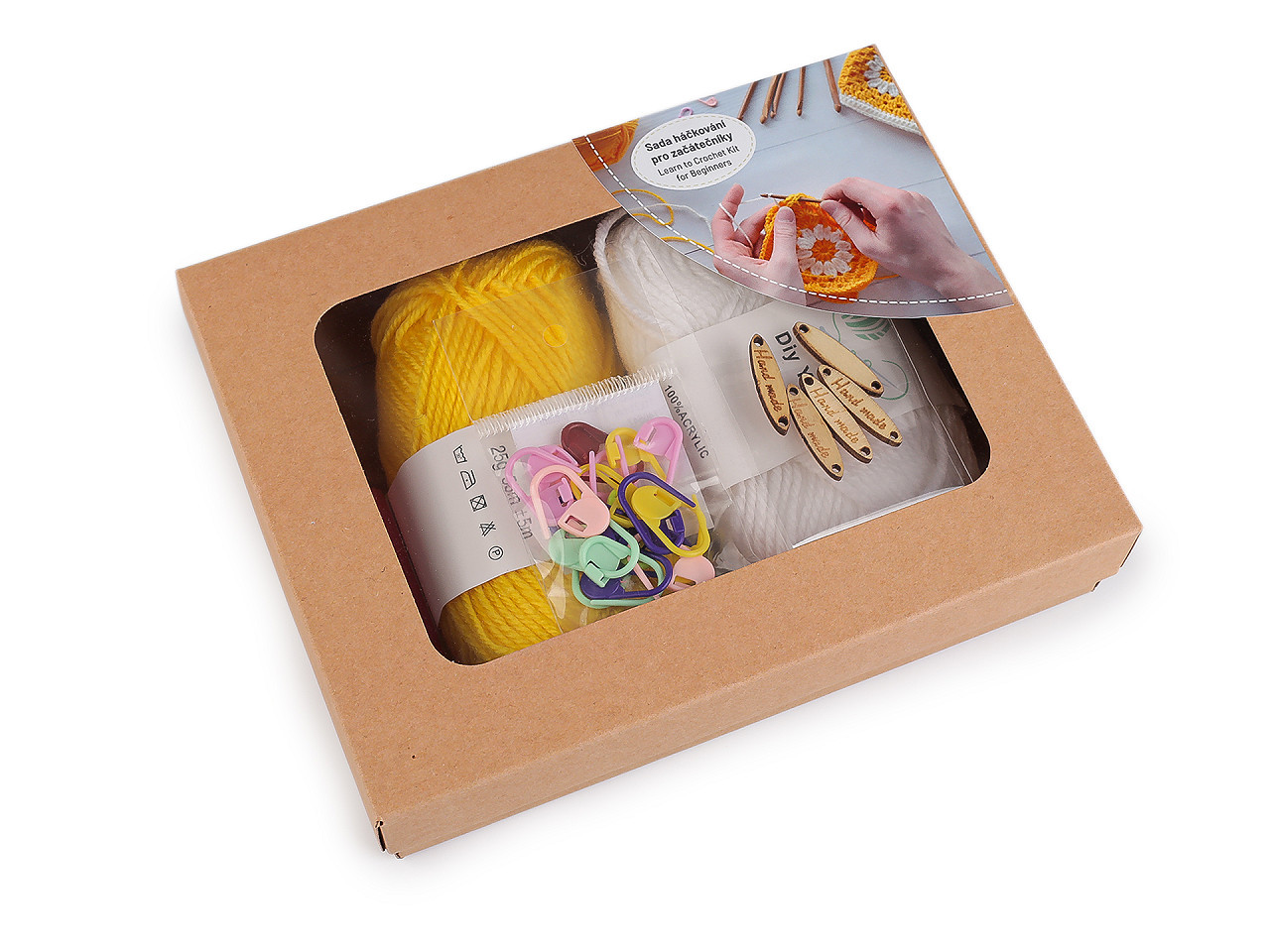 Háčkovací sadu ocení všichni začátečníci. V balení najdete 2 háčky ve velikosti 3,5 a 4 mm, plastové jehly (5 ks), plastové spínací špendlíky (20 ks), dřevěné cedulky "Hand made" (5 ks), příze (4 ks) a návod na základy háčkování.