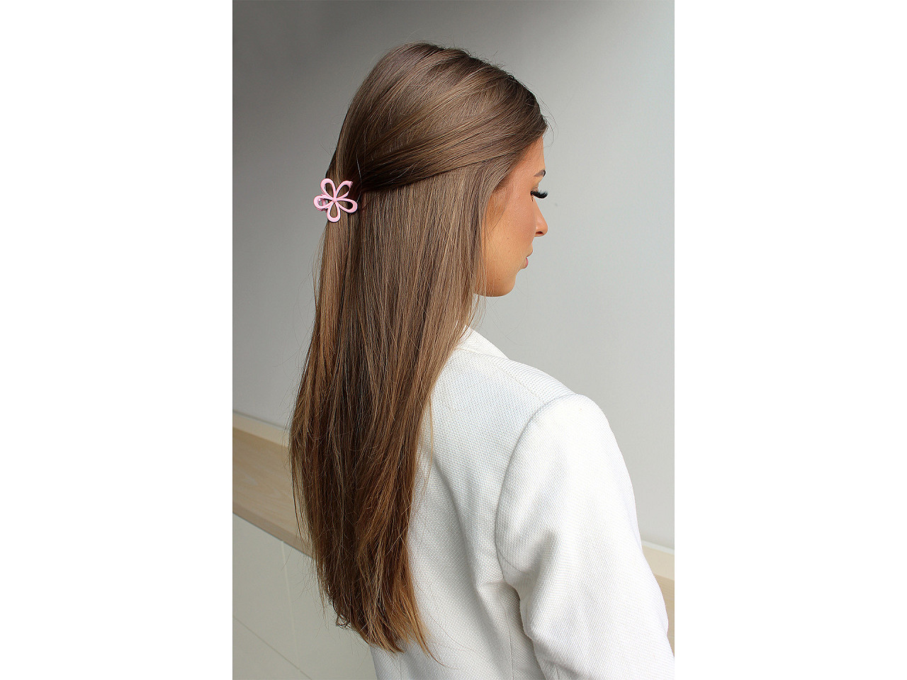 Malý kovový skřipec do vlasů ve tvaru květu je elegantní a stylový doplněk pro každodenní nošení. Díky matné povrchové úpravě působí moderně a snadno jej sladíte s jakýmkoli outfitem. Skřipec má silný stisk a pevné zuby, takže spolehlivě udrží vaše vlasy na místě bez nepříjemného tahání nebo sklouzávání. Ideální volba pro rychlé a pohodlné úpravy vlasů během celého dne.