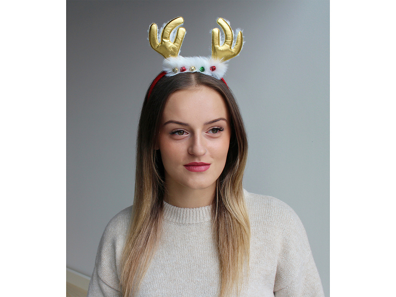 Oživte každou oslavu stylovým a vtipným doplňkem. Čelenka do vlasů se sobími parůžky a rolničkami je ideální volbou na vánoční večírky, karnevaly, rodinná setkání, školní představení i Silvestra. Skvěle ozvláštní fotokoutek a postará se o veselé vzpomínky s přáteli i rodinou. Parůžky jsou zepředu metalicky lesklé, zezadu příjemně měkké díky umělé kožešince. Rozměr jednoho parůžku je cca 7 x 10 cm. Dopřejte si zábavu a vánoční atmosféru s tímto originálním doplňkem.