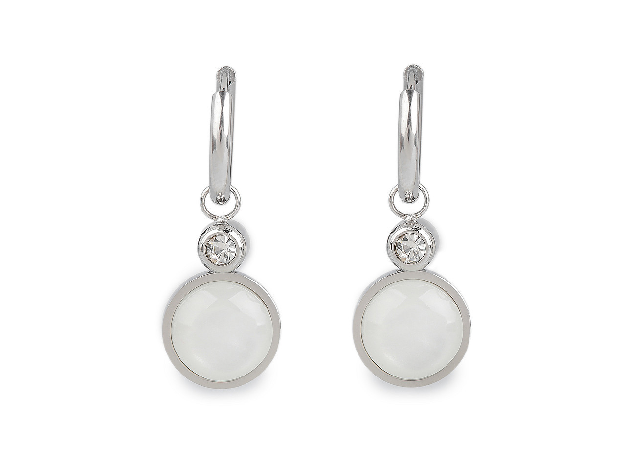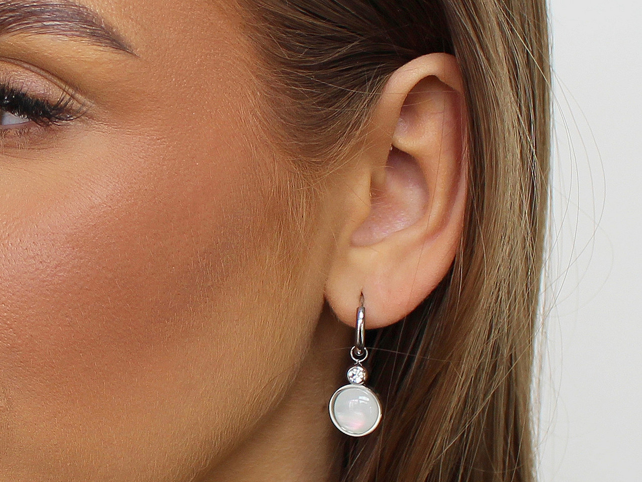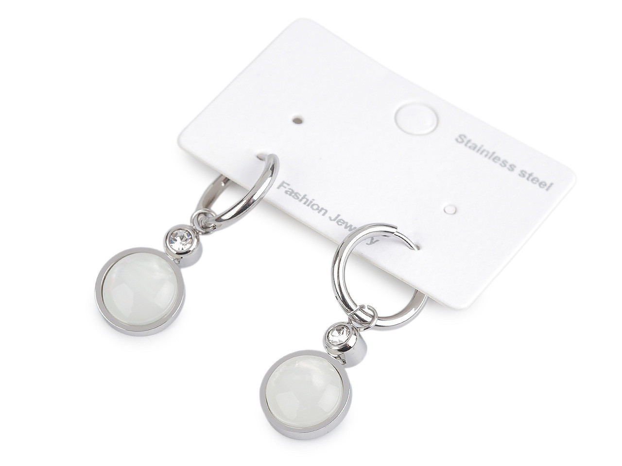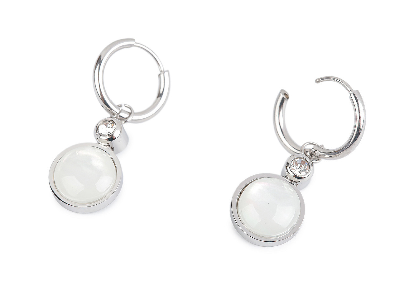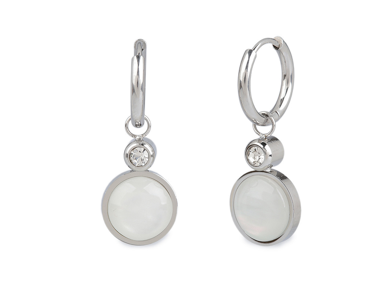 Elegantní náušnice kroužky z kvalitní nerezové oceli ozdobené přívěskem s broušeným kamínkem a imitací perleti s efektem kočičího oka. Vynikají univerzálností – perfektně doplní byznys styl, ležérní outfit i společenské šaty. Praktické zapínání na zacvaknutí umožňuje snadné nasazení a sundání, přívěsek lze odejmout a nosit náušnice i bez něj.