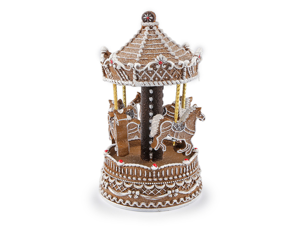 Vneste do svého domova kouzlo Vánoc s tímto působivým vánočním kolotočem, který věrně imituje perník a je pokrytý třpytivými glitry. Kolotoč je pohyblivý a po natažení strojku, zabudovaného v horní části dekorace, zahraje oblíbenou vánoční melodii "Rolničky". Detailní zpracování a nostalgická atmosféra zútulní každý interiér a navodí sváteční náladu. Ideální dekorace pro milovníky tradičních Vánoc.