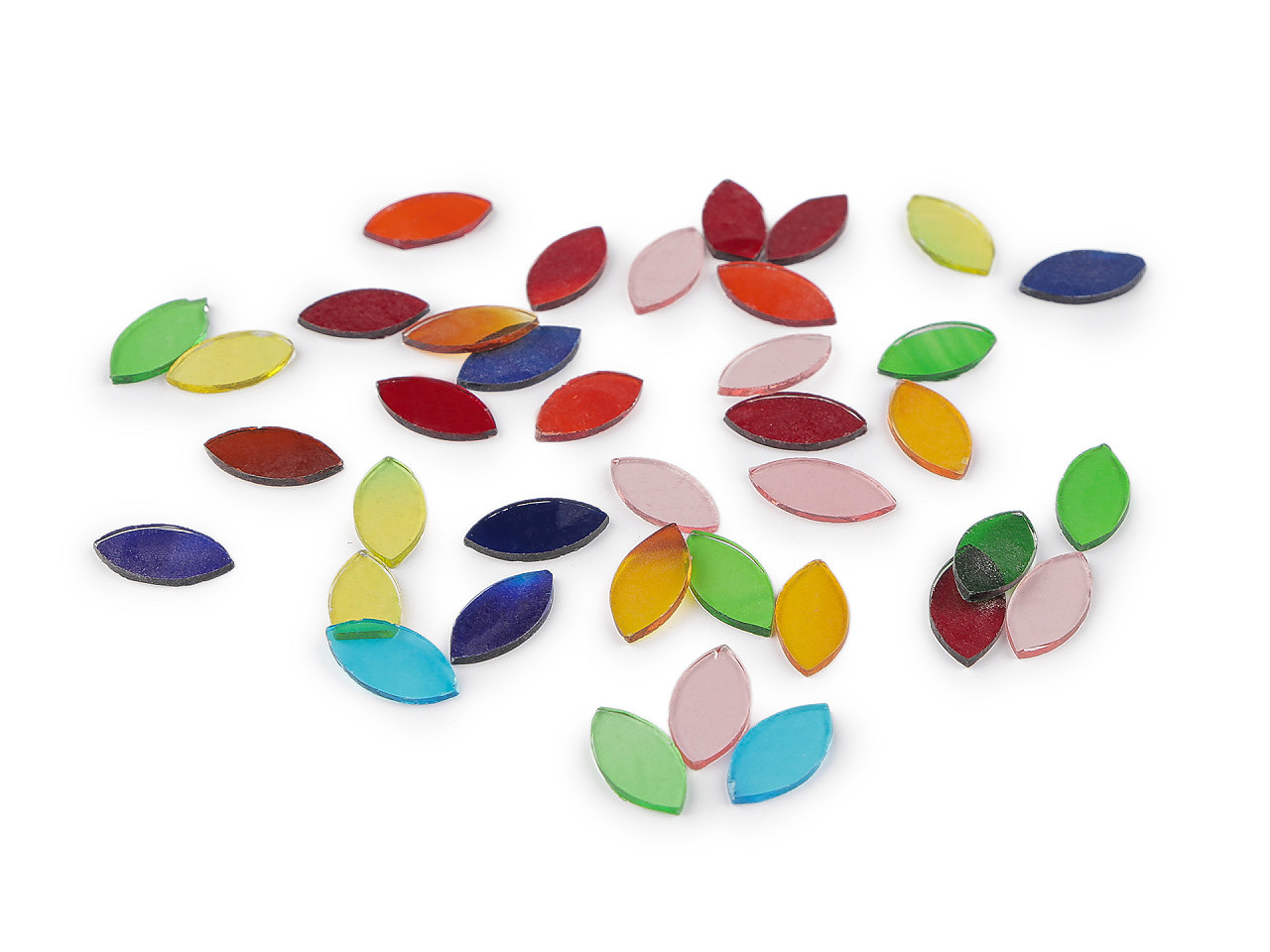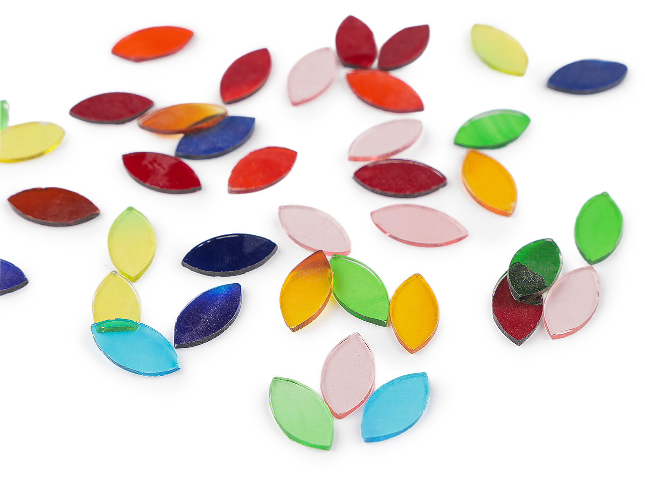 Objevte kreativní svět mozaiky s barevným mixem skleněných kamínků ve tvaru lístků. Tyto transparentní kamínky umožňují tvořit originální obrazce a snadno je nalepíte na plast, dřevo, kámen, kov, keramiku a další povrchy. Ideální na dekoraci krabiček, květináčů, šperků, váz, svícnů, lahví či kamenů.