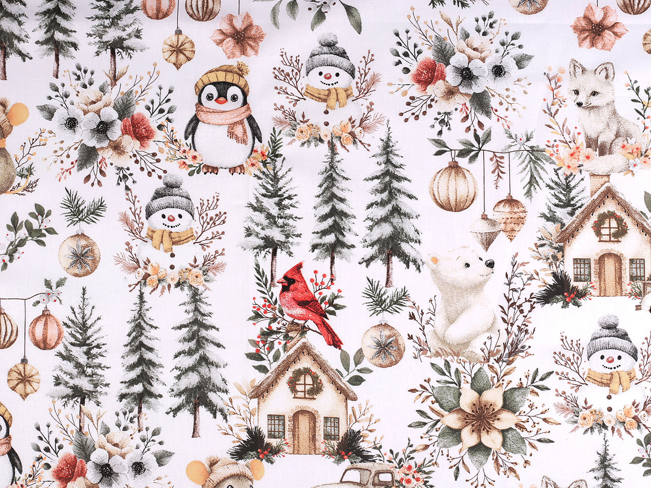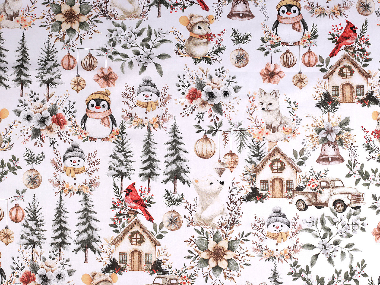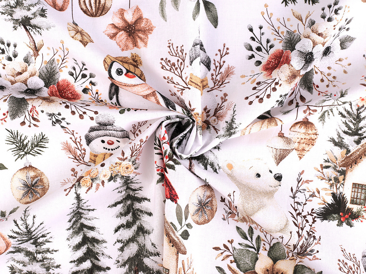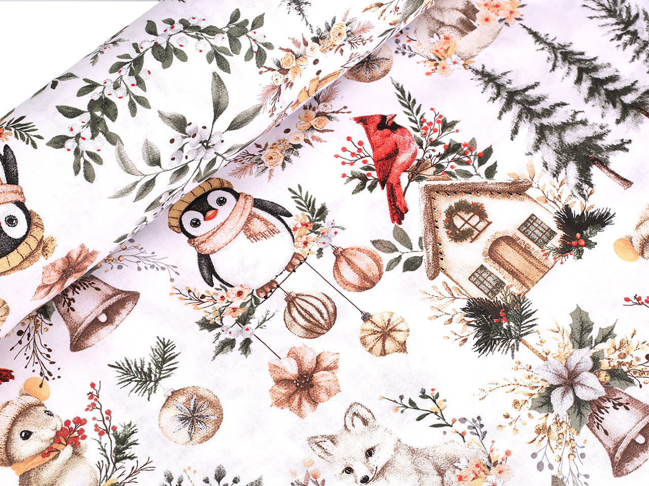 Objevte krásu vánoční bavlněné látky plátno, která vás svými jemnými a veselými motivy přenese do pohádkové atmosféry Vánoc. Tento kvalitní přírodní materiál je ideální pro šití vánočních dekorací – od ubrusů a povlaků na polštáře až po originální pytlíčky a ložní povlečení. Ušité výrobky dodají vašemu domovu útulné a hřejivé kouzlo zimních svátků.