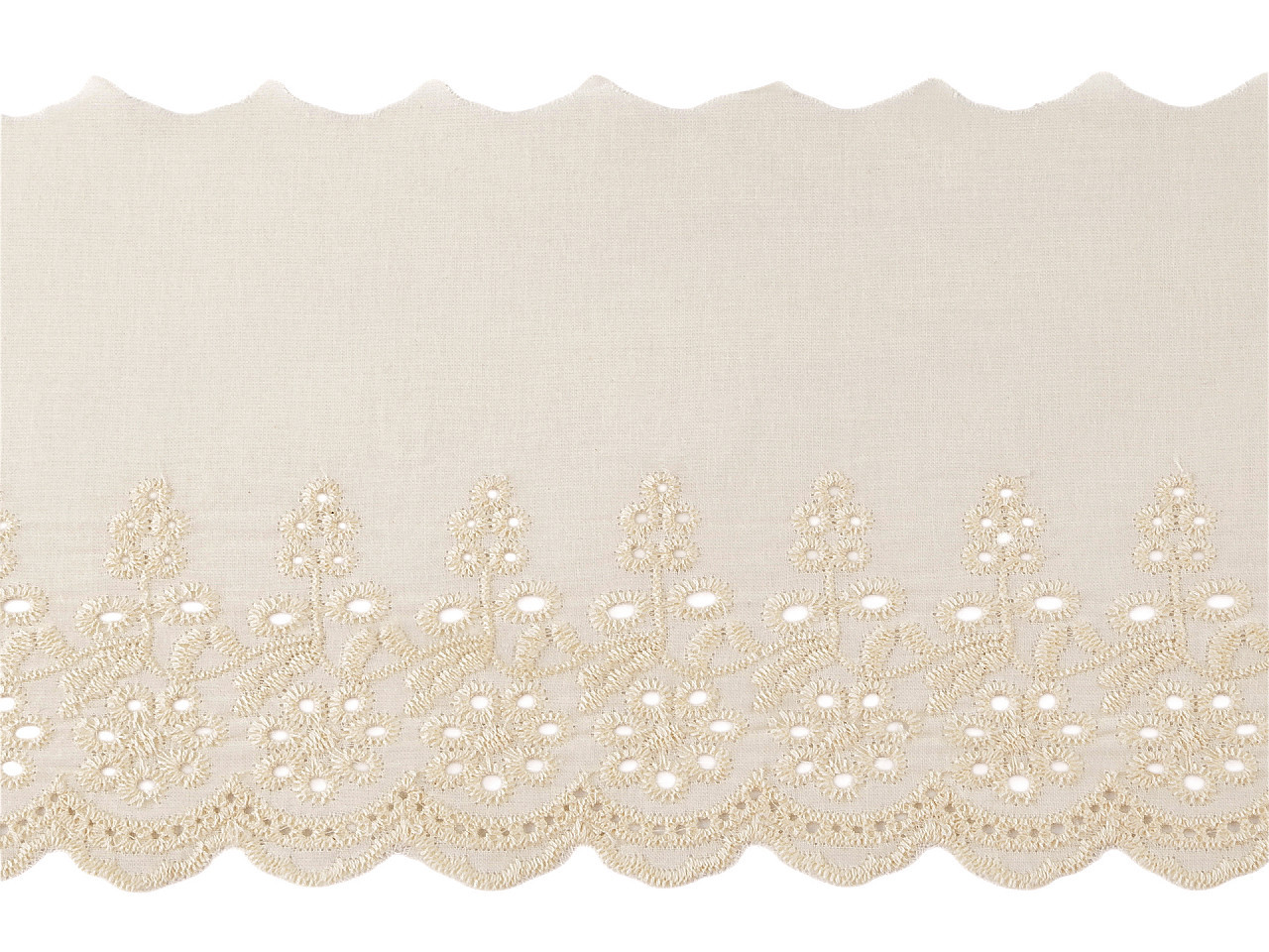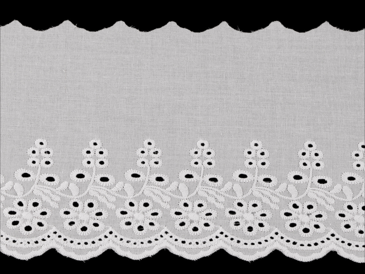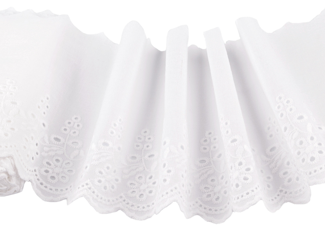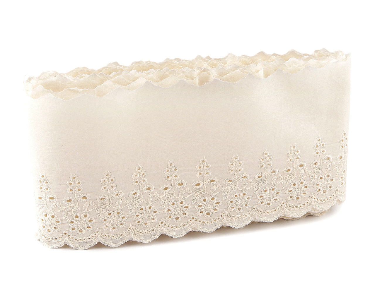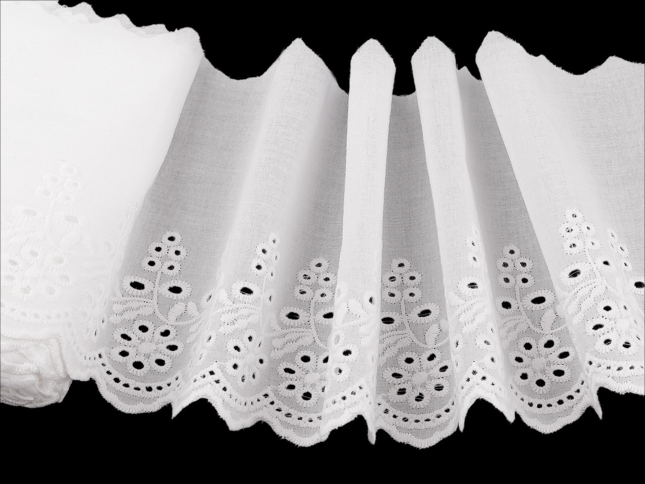 Oživte svůj domov i šatník elegantní bavlněnou madeirou s dírkovanou výšivkou. Madeira je ideální k ozdobení ubrusů, závěsů, dekoračních polštářů či ložního prádla. Snadno ji použijete také na oděvy – jako originální lem rukávů, sukní nebo výstřihů. Výhodou je kvalitní bavlněný materiál a univerzální využití pro kreativní dekorace. Šíře nevyšité části se může mírně lišit (±10%), což dodává každému kusu jedinečný vzhled. Vnesete tak do svého interiéru nebo oblečení stylovou eleganci.