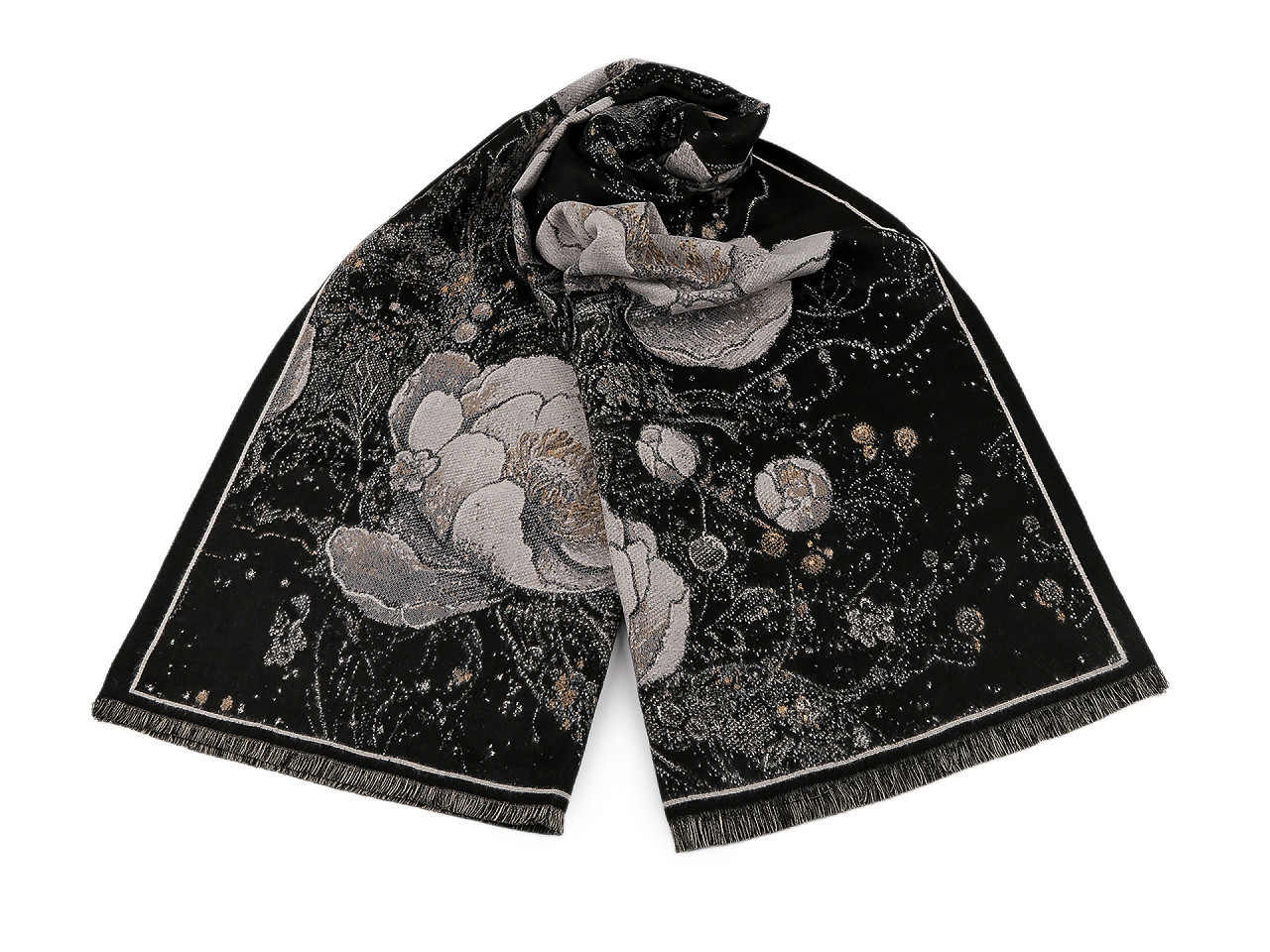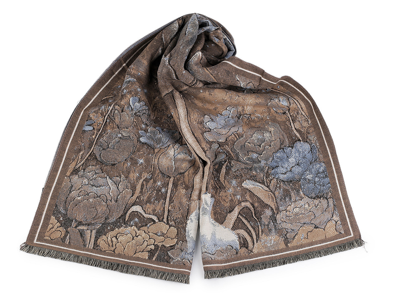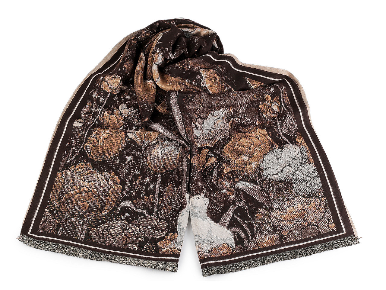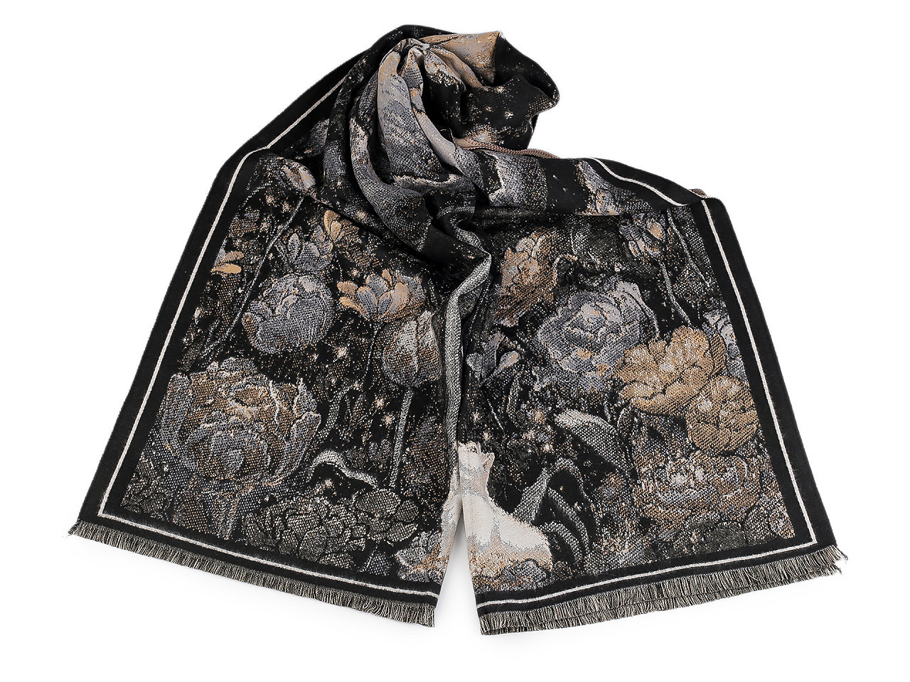 Dopřejte si jedinečný doplněk, který vás zahřeje i ozdobí. Tento velký šátek typu kašmír s elegantním květinovým motivem je vyrobený z hřejivého a hebkého materiálu (viskóza a polyester), který je velmi příjemný na dotek. Díky své téměř dvoumetrové délce nabízí široké možnosti nošení – stylově se hodí ke kabátu, bundě i svetru. Zakončení s krátkými třásněmi dodává šátku moderní vzhled.