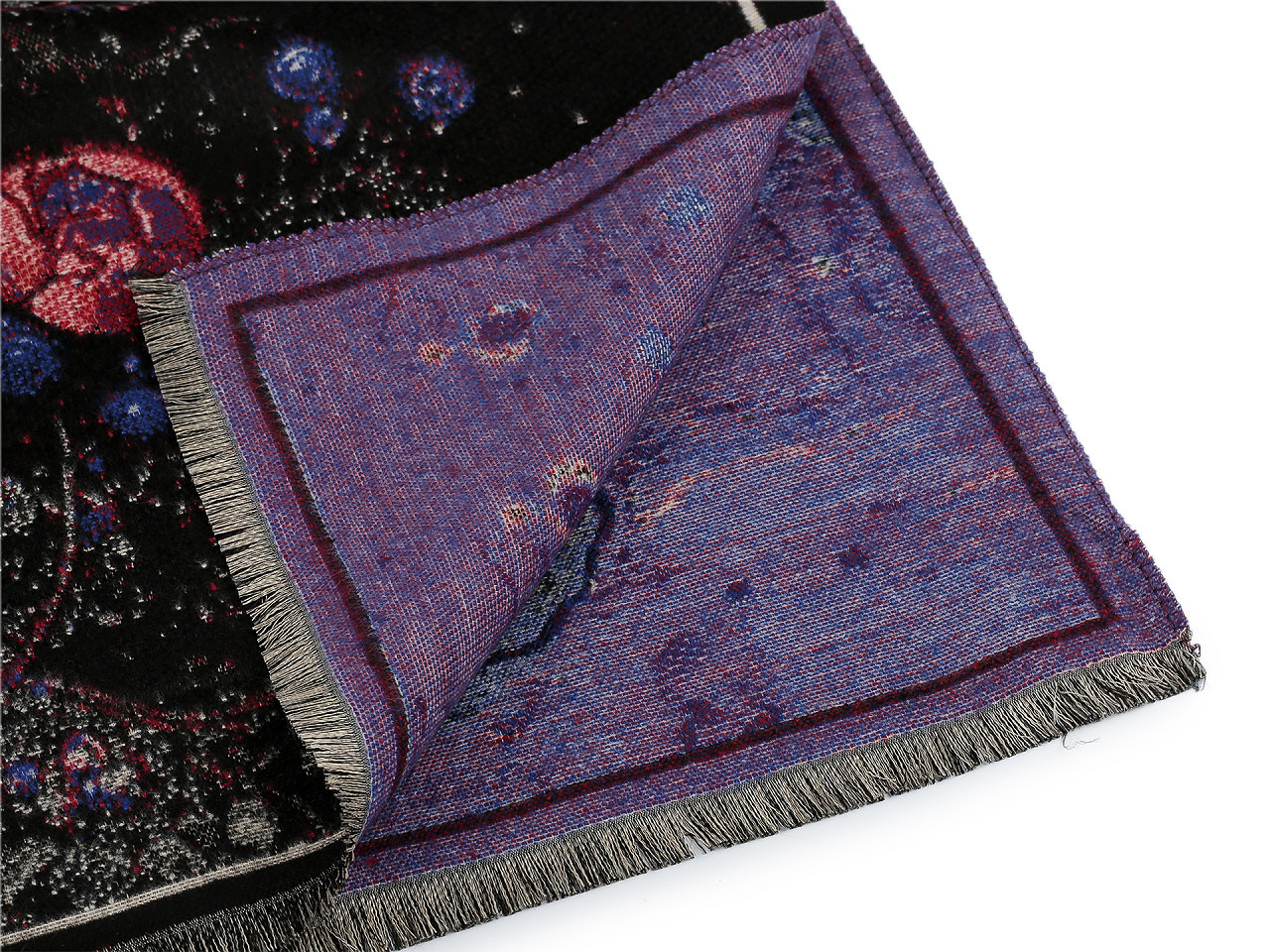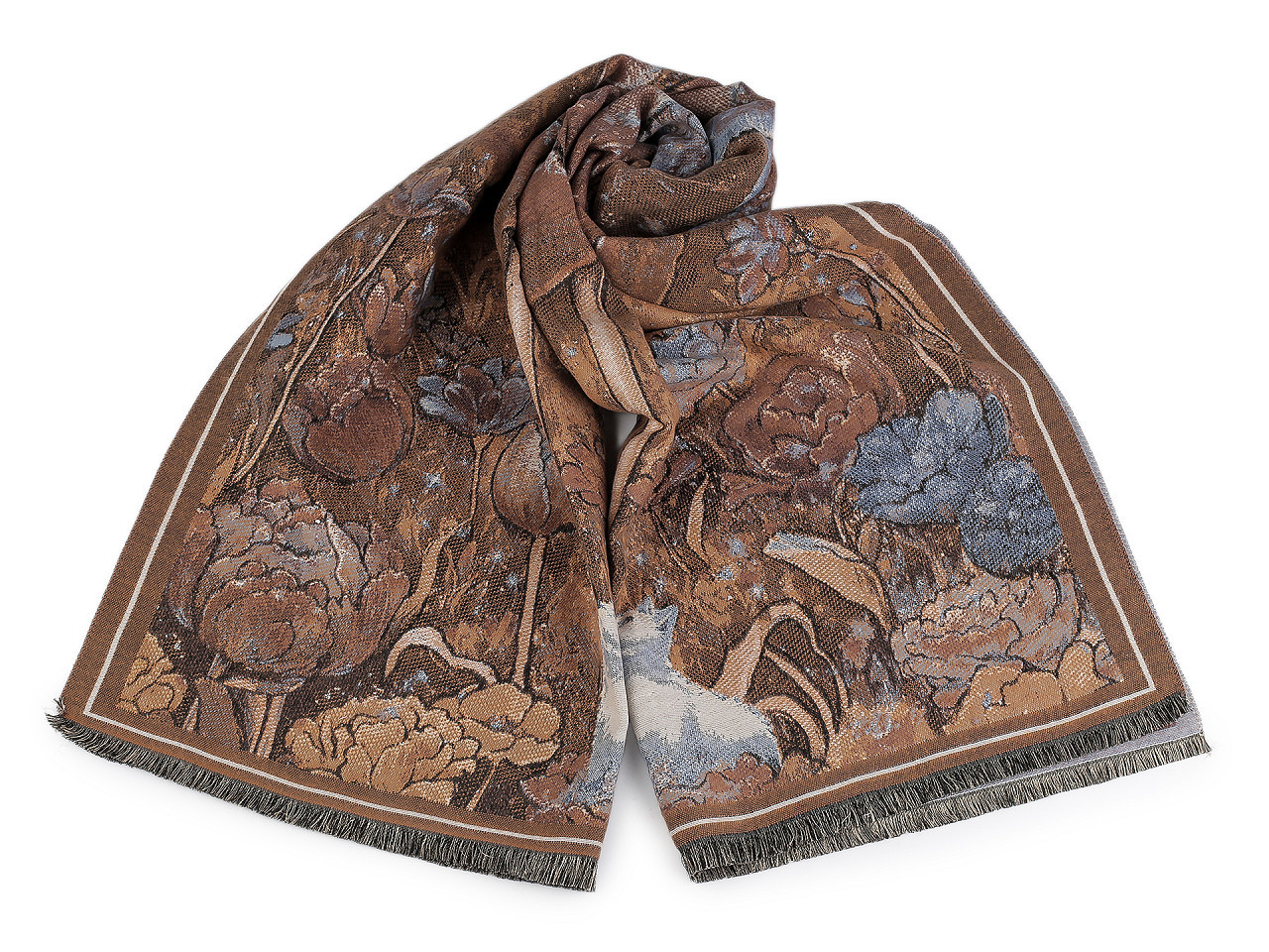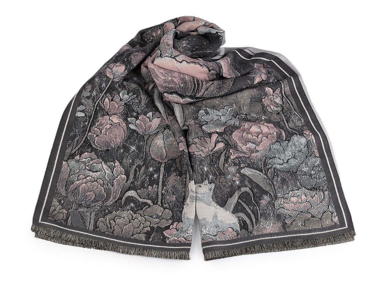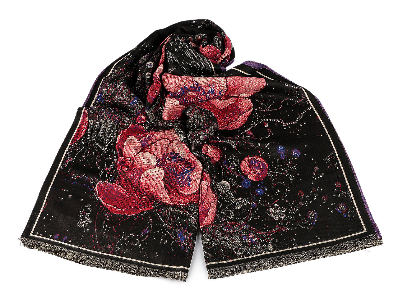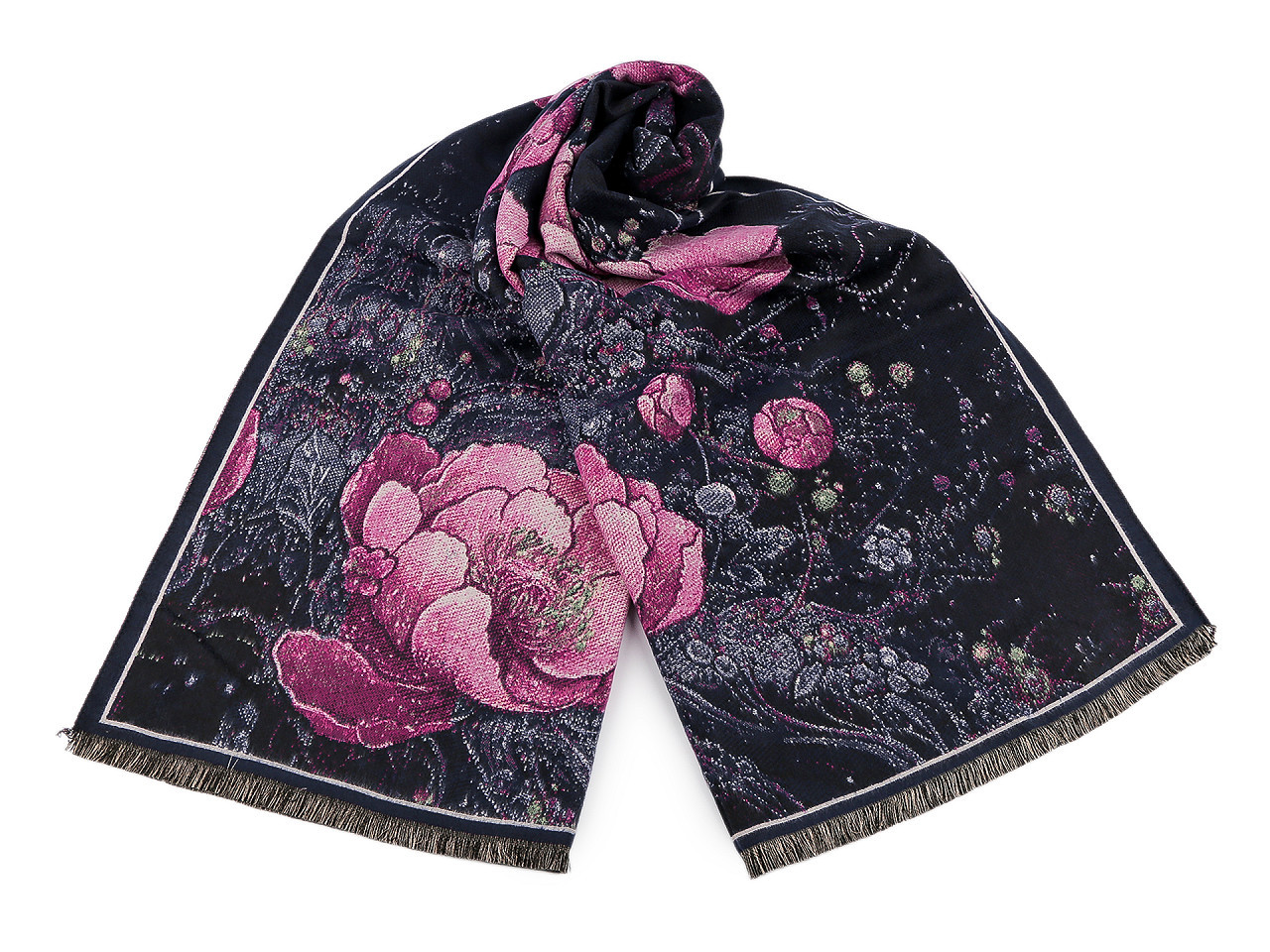 Dopřejte si jedinečný doplněk, který vás zahřeje i ozdobí. Tento velký šátek typu kašmír s elegantním květinovým motivem je vyrobený z hřejivého a hebkého materiálu (viskóza a polyester), který je velmi příjemný na dotek. Díky své téměř dvoumetrové délce nabízí široké možnosti nošení – stylově se hodí ke kabátu, bundě i svetru. Zakončení s krátkými třásněmi dodává šátku moderní vzhled.