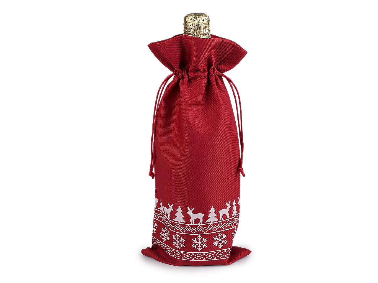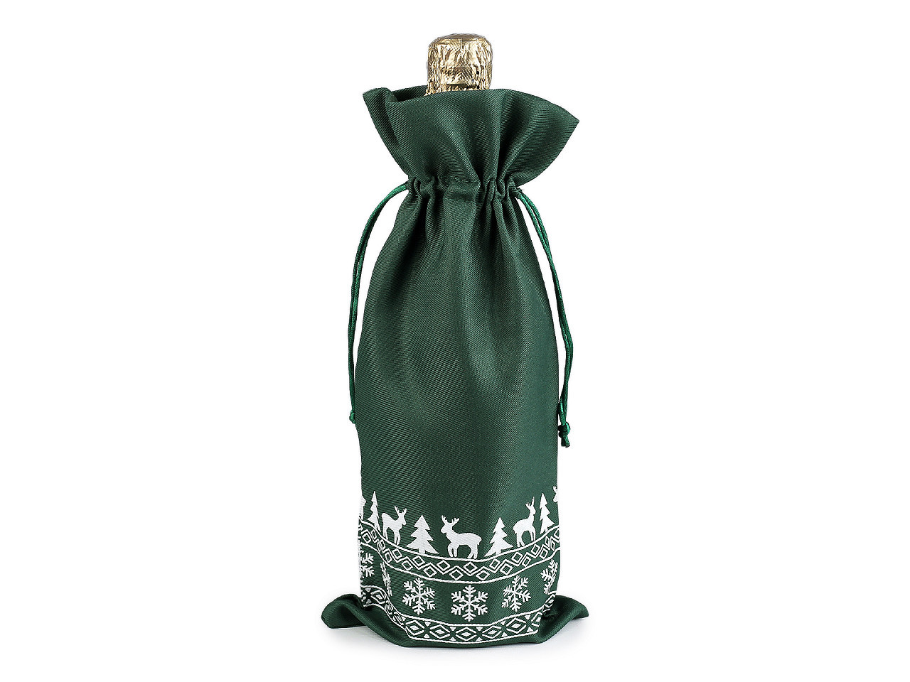 Krásný vánoční dárkový pytlík na láhev s oboustranným potiskem sobů, stromečků a vloček je ideální pro stylové balení lahví nebo jiných podlouhlých dárků. Díky dostatečné výšce se do něj vejde jak láhev alkoholu, tak domácí limonáda. Pytlík snadno uzavřete pomocí kulatých saténových šňůrek, které dodají dárku osobní kouzlo a půvab. Ušetříte čas při balení a zajistíte svému dárku originální vzhled. Láhev není součástí pytlíku.