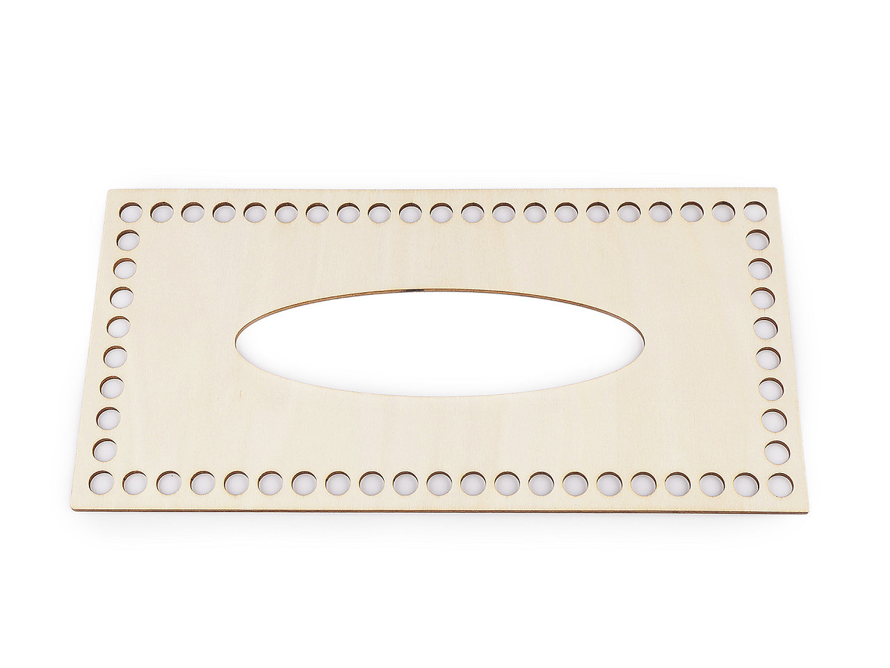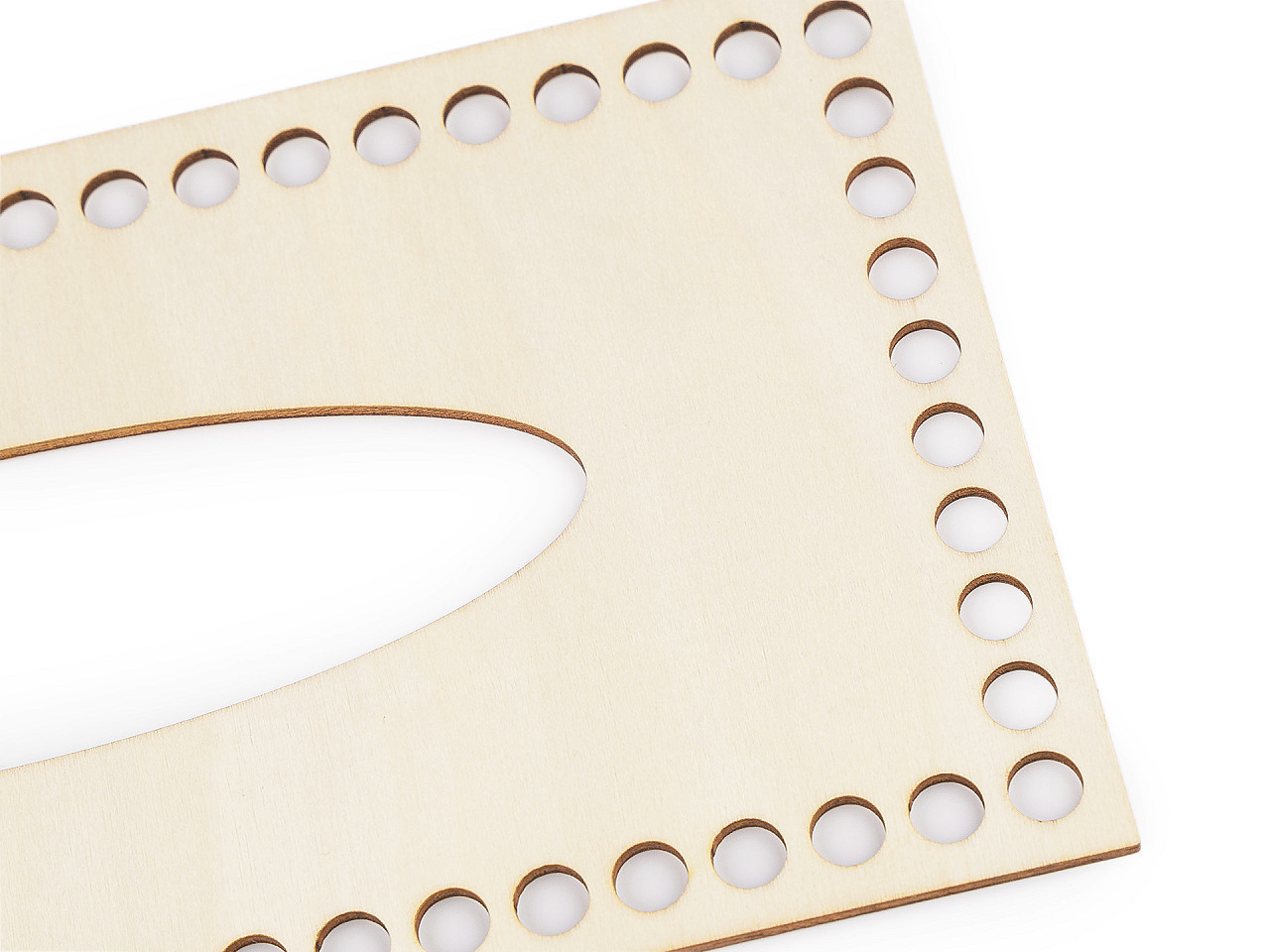 Dřevěné víko na krabičku na kapesníky je přesně vyřezané laserem a připravené pro vaše kreativní projekty. Otvory po obvodu (celkem 58) jsou ideální pro háčkování nebo proplétání pedigem. Uprostřed se nachází velký otvor o rozměrech 4 x 14 cm. Polotovar můžete také domalovat akrylovými barvami, popisovači či ozdobit ubrouskovou technikou a vytvořit si tak zcela originální a funkční dekoraci.