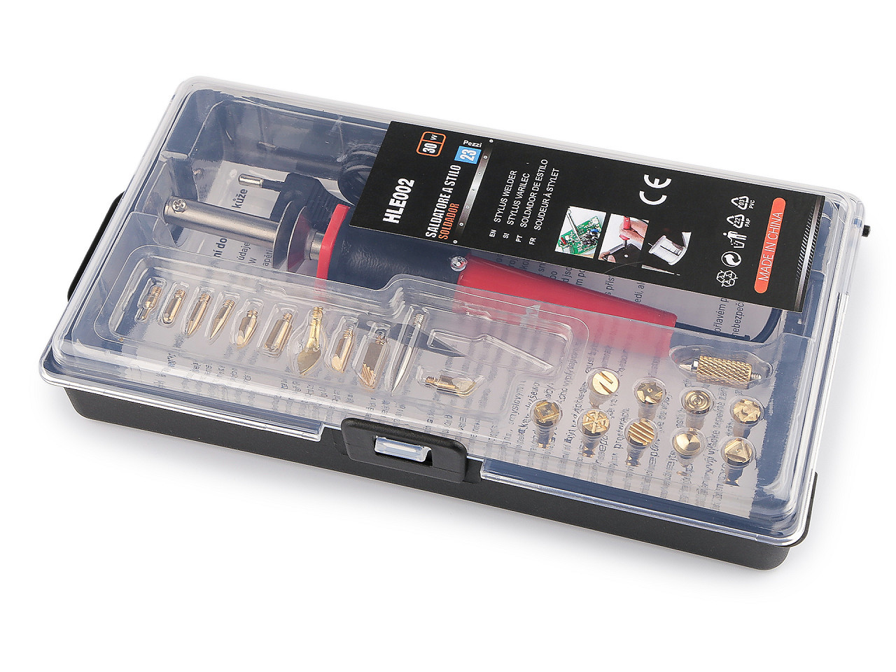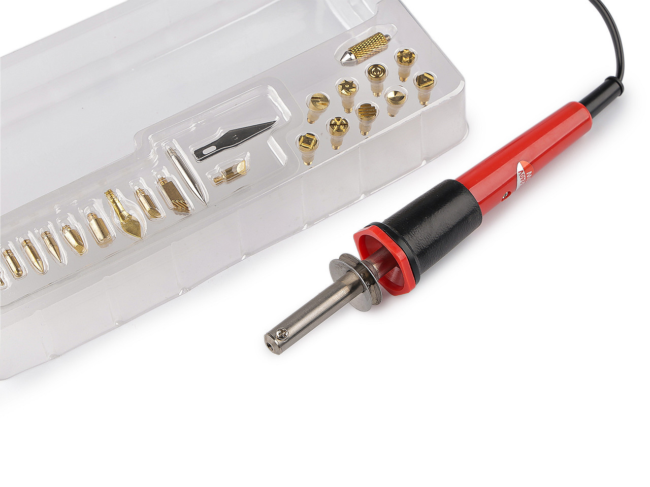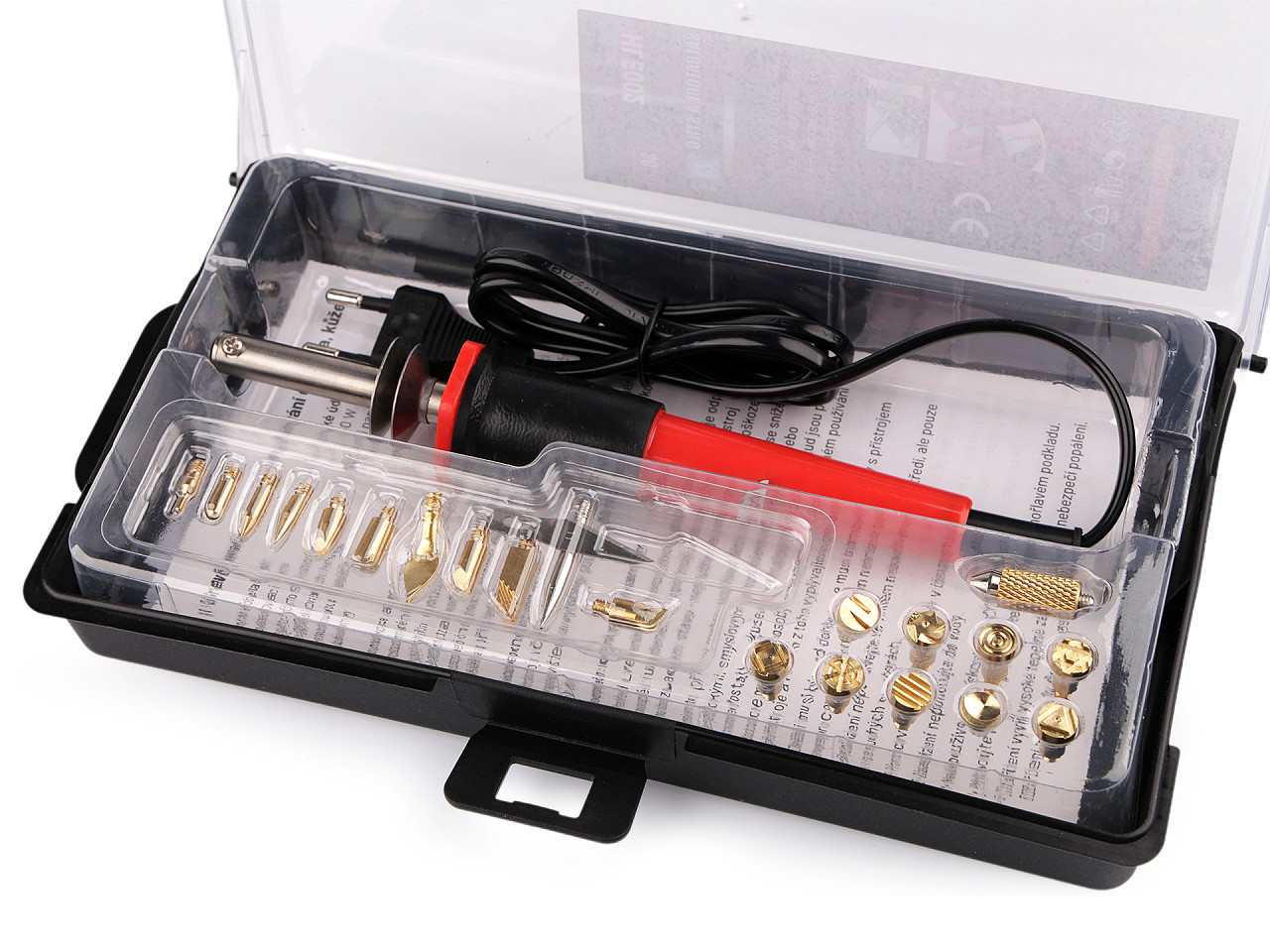 Objevte kreativní možnosti se sadou na vypalování do dřeva, kůže a korku. Gravírovací pero (pyrograf, pájka) s výkonem 30 W vám umožní snadno vyrábět originální dekorace, dárky, jmenovky, šperky, vánoční ozdoby i ozdobit kuchyňské náčiní. Sada obsahuje vypalovací pero, 20 vyměnitelných hrotů (včetně grafických motivů), dvě šablony s písmeny, skalpel a praktický plastový box pro přehledné uložení nářadí. Pero lze využít i jako páječku, ideální pro modeláře či techniku Tiffany.