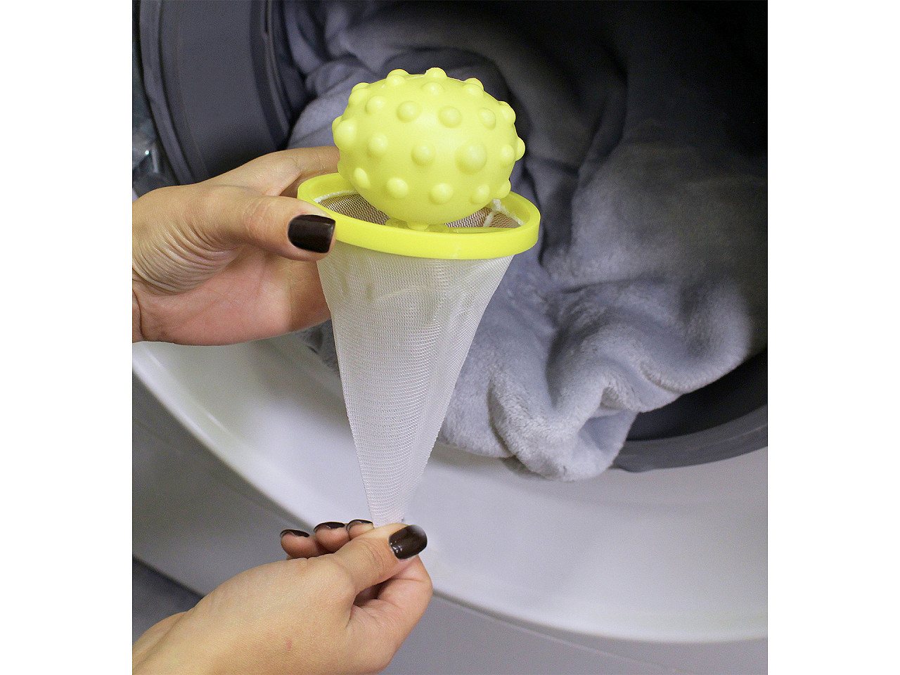 - Zachytává vlákna, chlupy, vlasy, žmolky a prach během praní