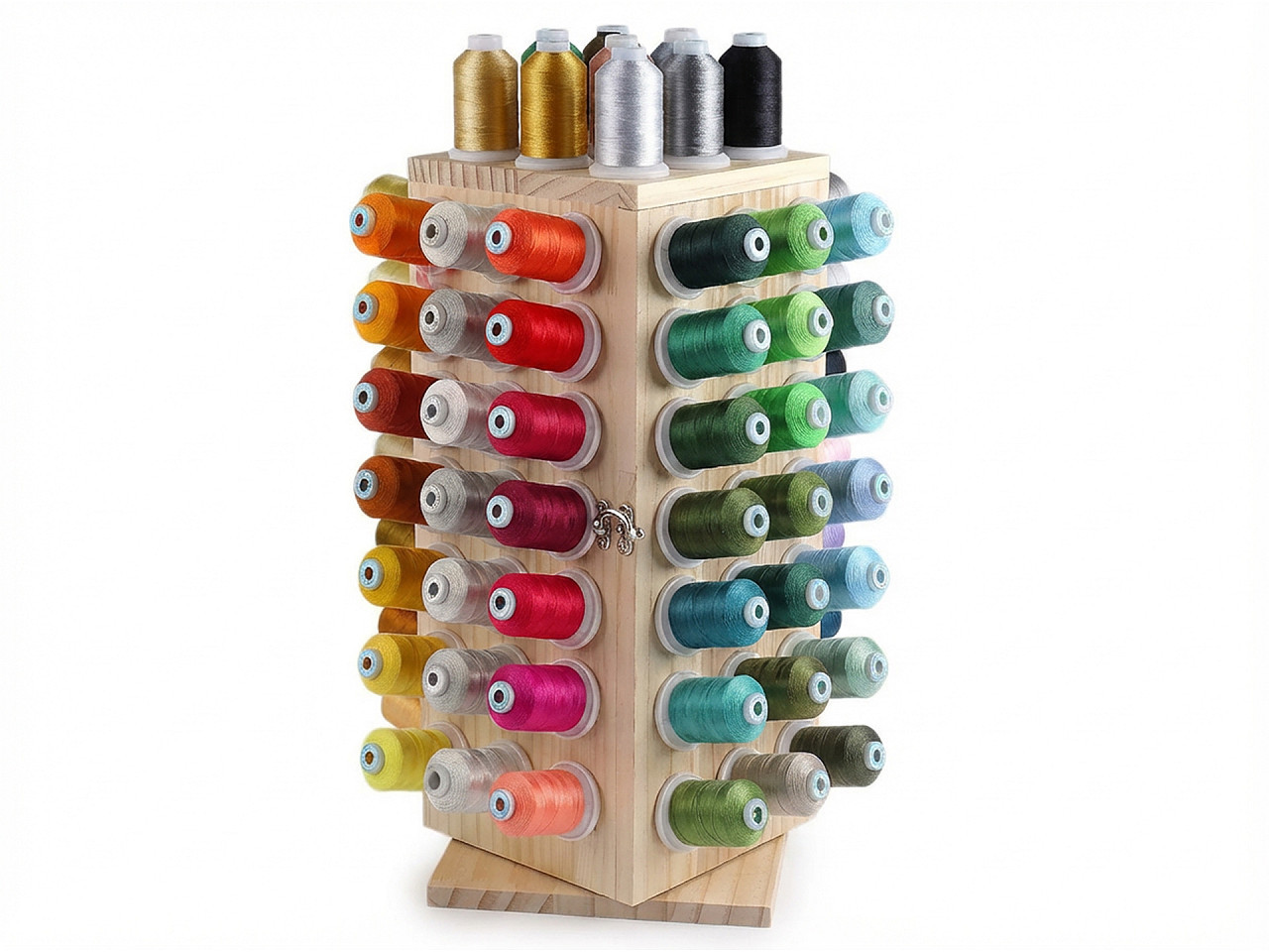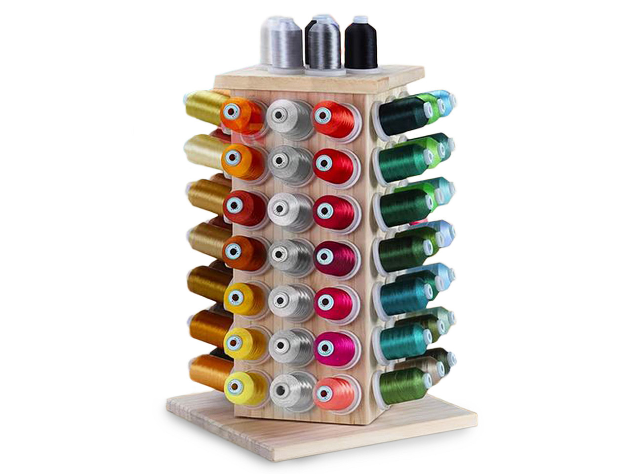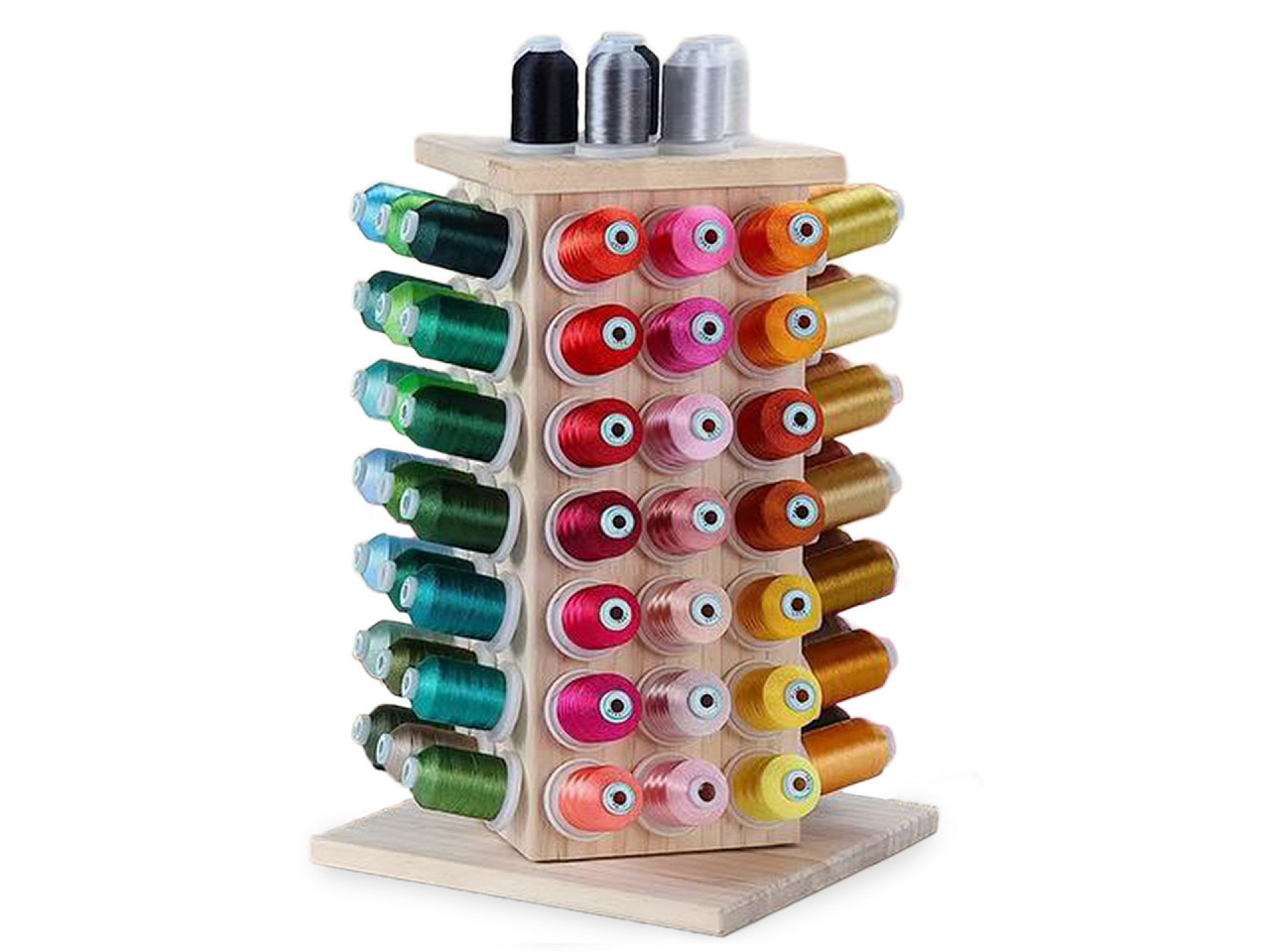 Otočný dřevěný stojan na nitě – praktický organizér pro šicí potřeby. Udržujte svůj šicí koutek dokonale uspořádaný s elegantním otočným dřevěným stojanem na nitě. Tento kvalitní stojan pojme až 93 cívek a díky chytrému otočnému mechanismu vždy snadno najdete potřebnou barvu nitě. Integrovaný úložný prostor poskytuje místo pro jehly, nůžky či jiné šicí doplňky, takže máte vše po ruce. Stabilní konstrukce a kompaktní rozměry zaručují, že stojan nezabere mnoho místa, ale přesto nabídne maximální funkčnost. Ideální doplněk pro každou švadlenku i profesionální dílnu.