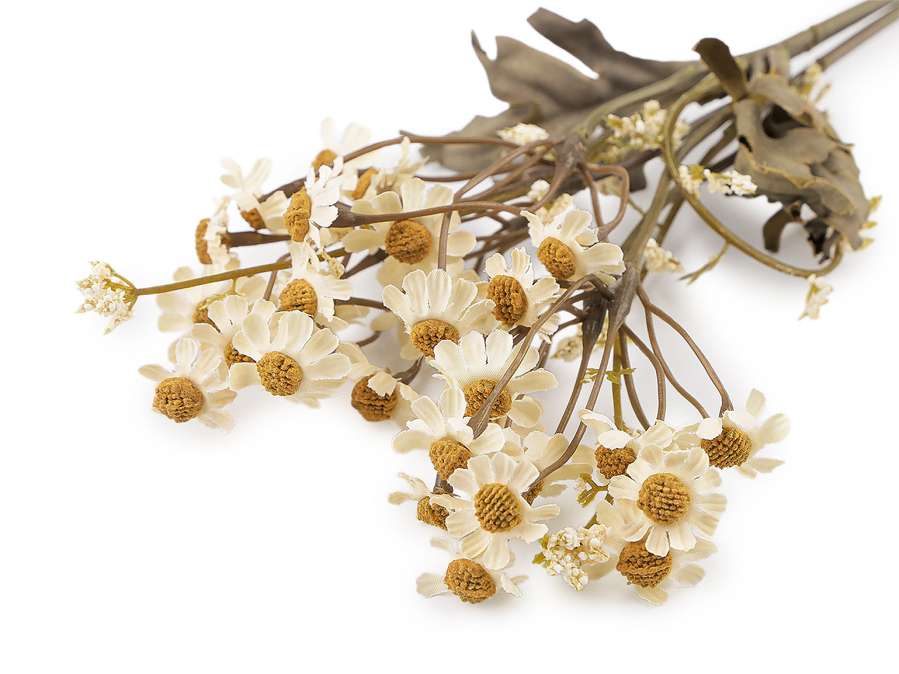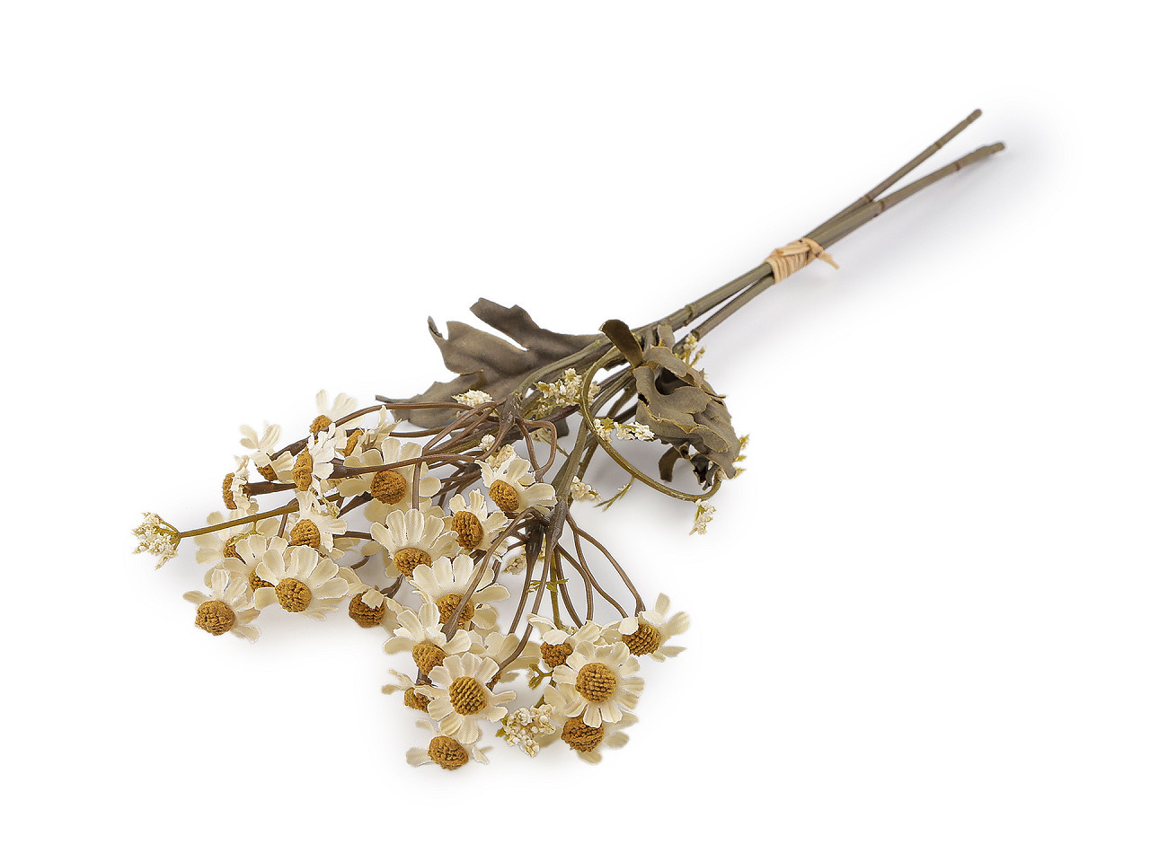 Dodejte svému domovu či dekoraci nádech přírodní krásy s umělým heřmánkem s realistickým vzhledem. Tento elegantní svazek obsahuje 3 kvalitně zpracované stonky, převázané přírodním provázkem, které působí téměř jako čerstvě utržené květiny. Díky textilním květům a listům a drátku uvnitř stonků je snadné je tvarovat podle potřeby. Umělý heřmánek se skvěle hodí do vázy, květinových aranžmá, věnců, ikeban či originálních vlasových doplňků.