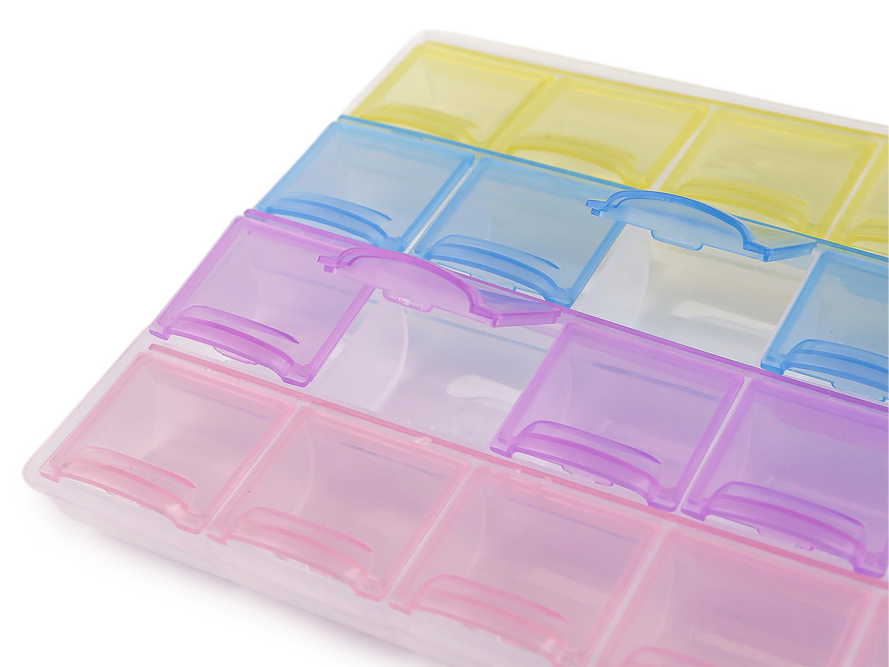 Plastový organizér s 28 přihrádkami – pro přehledné uložení drobných předmětů. Praktický plastový box s 28 přihrádkami o rozměru 24 × 28 mm je ideálním řešením pro systematické uskladnění drobností. Perfektně se hodí pro korálky, flitry, bižuterní komponenty, hotfix kamínky a další malé předměty. Díky kompaktním rozměrům se snadno vejde i do menších prostor, šuplíků či cestovních tašek.