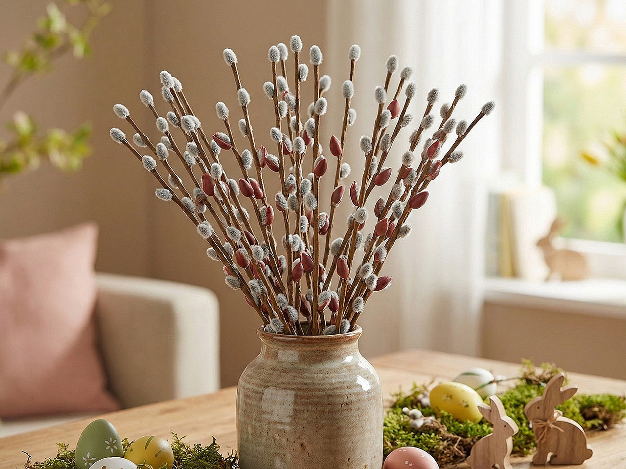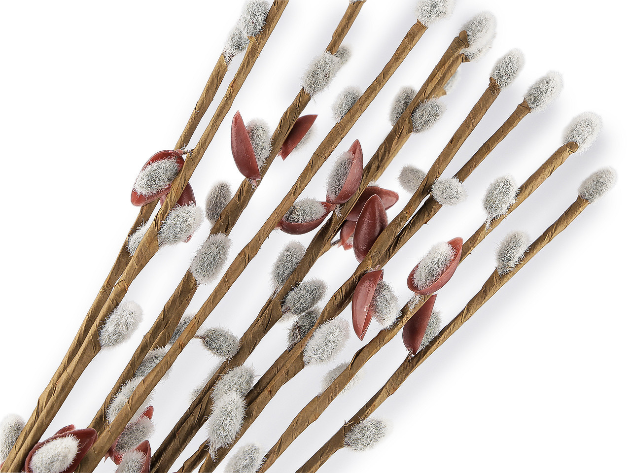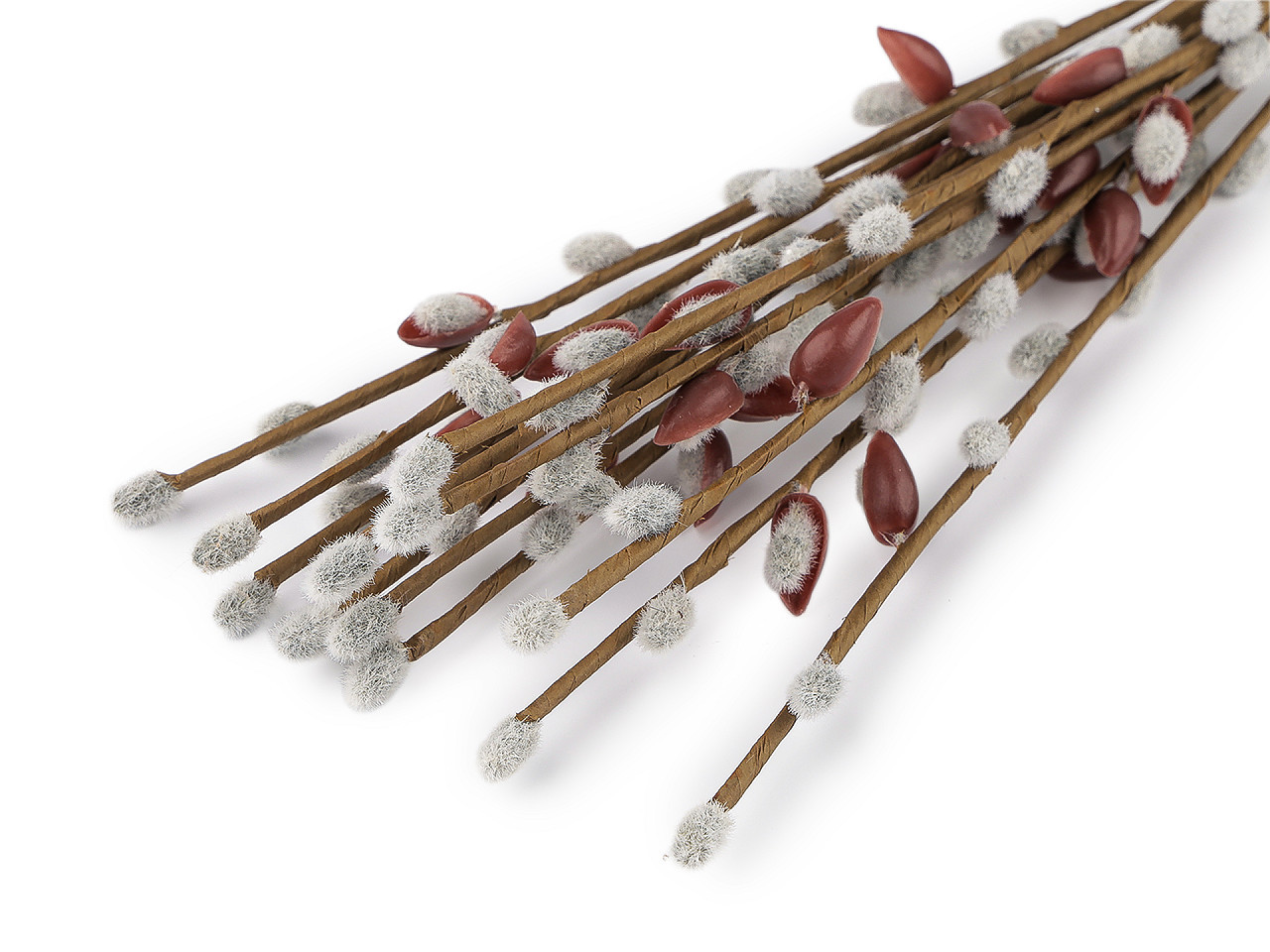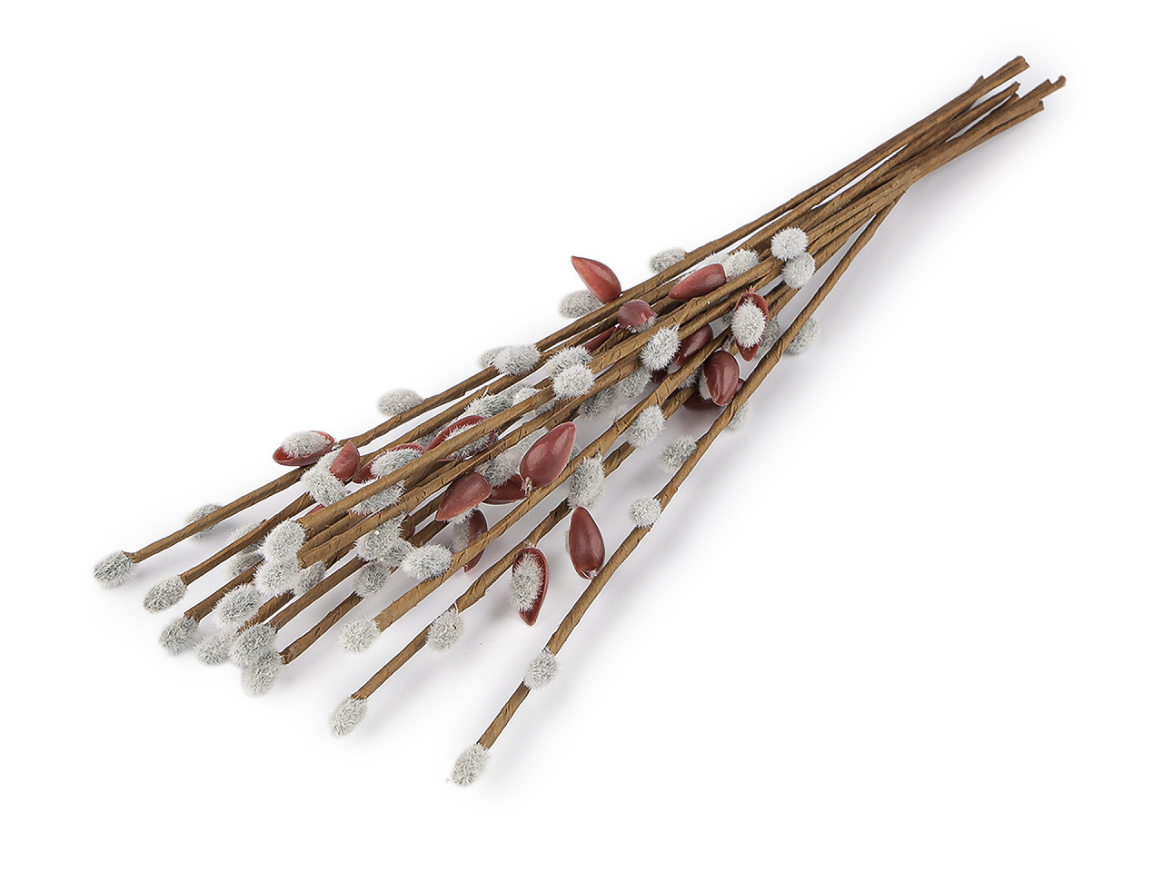 Umělá větvička s kočičkami – dekorace pro jarní a velikonoční aranžmá. Dodáte svým jarním a velikonočním dekoracím jemný přírodní nádech díky této realistické umělé větvičce s kočičkami. Díky drátku uvnitř stonku lze větvičku snadno tvarovat podle potřeby – ideální pro věnce, květinové vazby i různé aranžmá. Chlupatý povrch kočiček dokonale napodobuje vzhled živých větviček, takže působí velmi autenticky a přinese do vašeho interiéru útulnou atmosféru po celý rok.