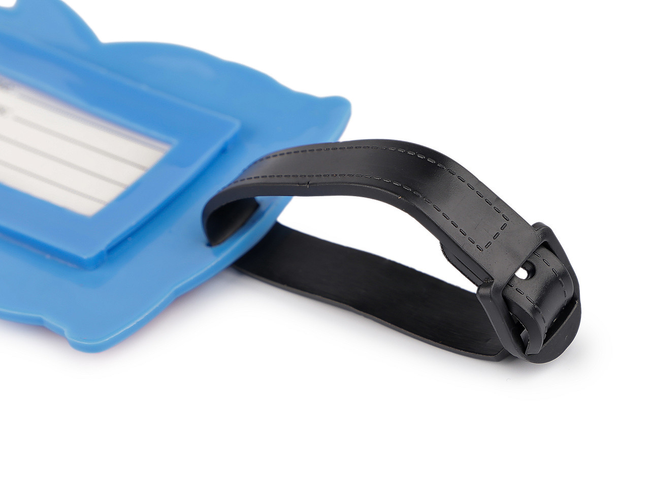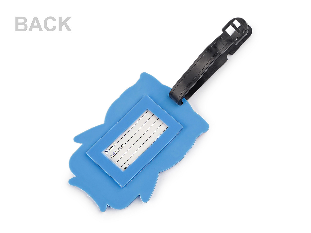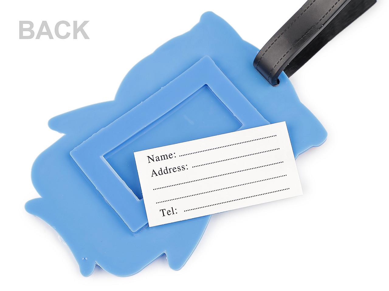 Na zadní straně najdete praktické kolonky pro vyplnění jména, adresy, telefonu či e‑mailu. Kartička s údaji je chráněna průhlednou fólií a lze ji jednoduše vysunout. Díky pružnému silikonovému materiálu je visačka odolná proti poškození, lehká a snadno se připevní pomocí přiloženého pásku.