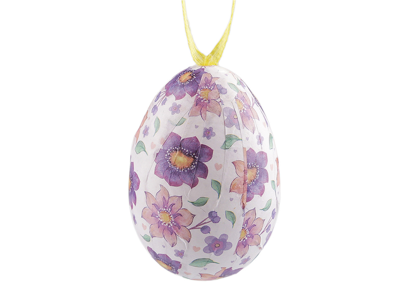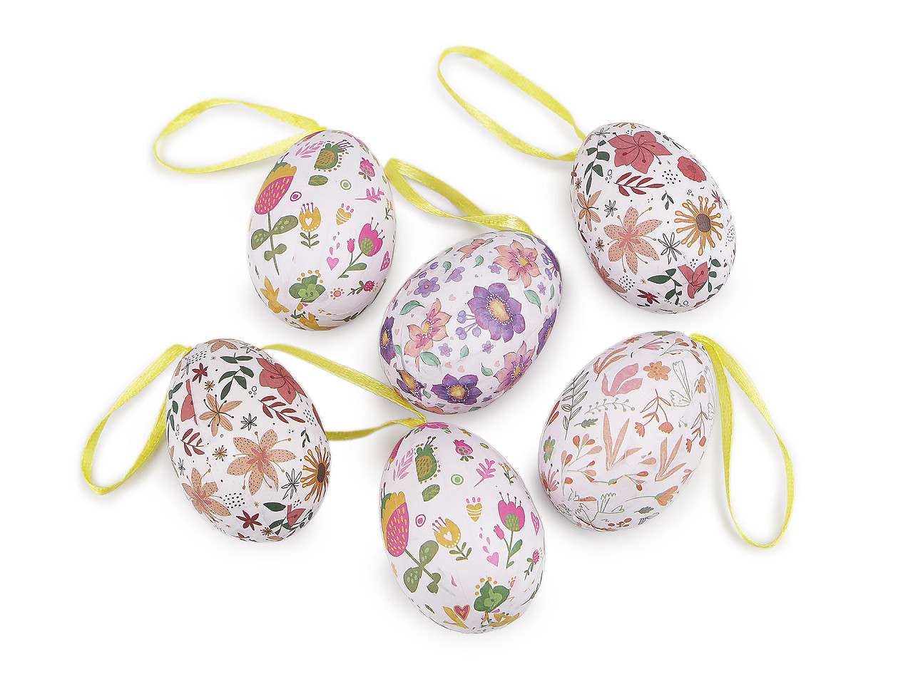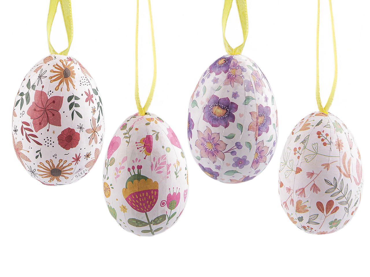 Velikonoční vajíčka k zavěšení – lehká dekorace s květinovým motivem. Ozdobte svůj domov originálními velikonočními vajíčky s jemnými květinovými vzory, která díky praktickému poutku snadno zavěsíte na větvičky ve váze, jarní věnce či do svátečních aranžmá. Základ z lehkého polystyrenu zajišťuje snadnou manipulaci i bezpečné použití. Ideální doplněk pro vaši velikonoční výzdobu, který vnese do interiéru svěžest a radost jarních svátků.