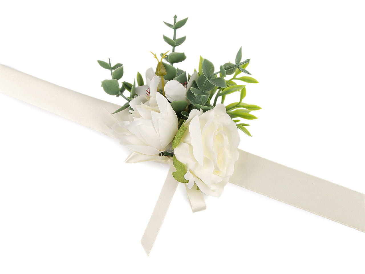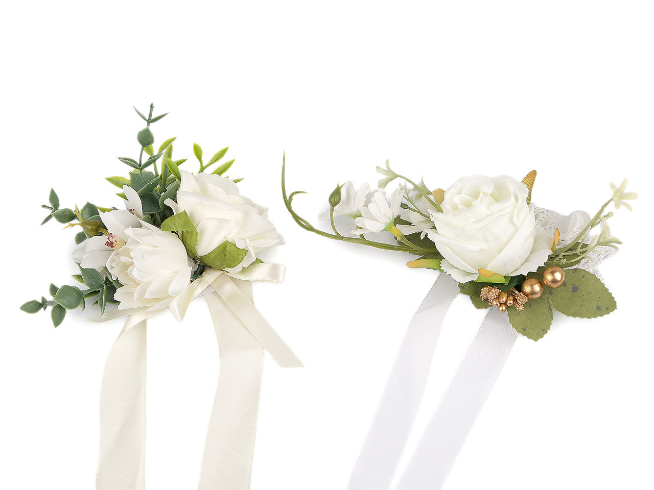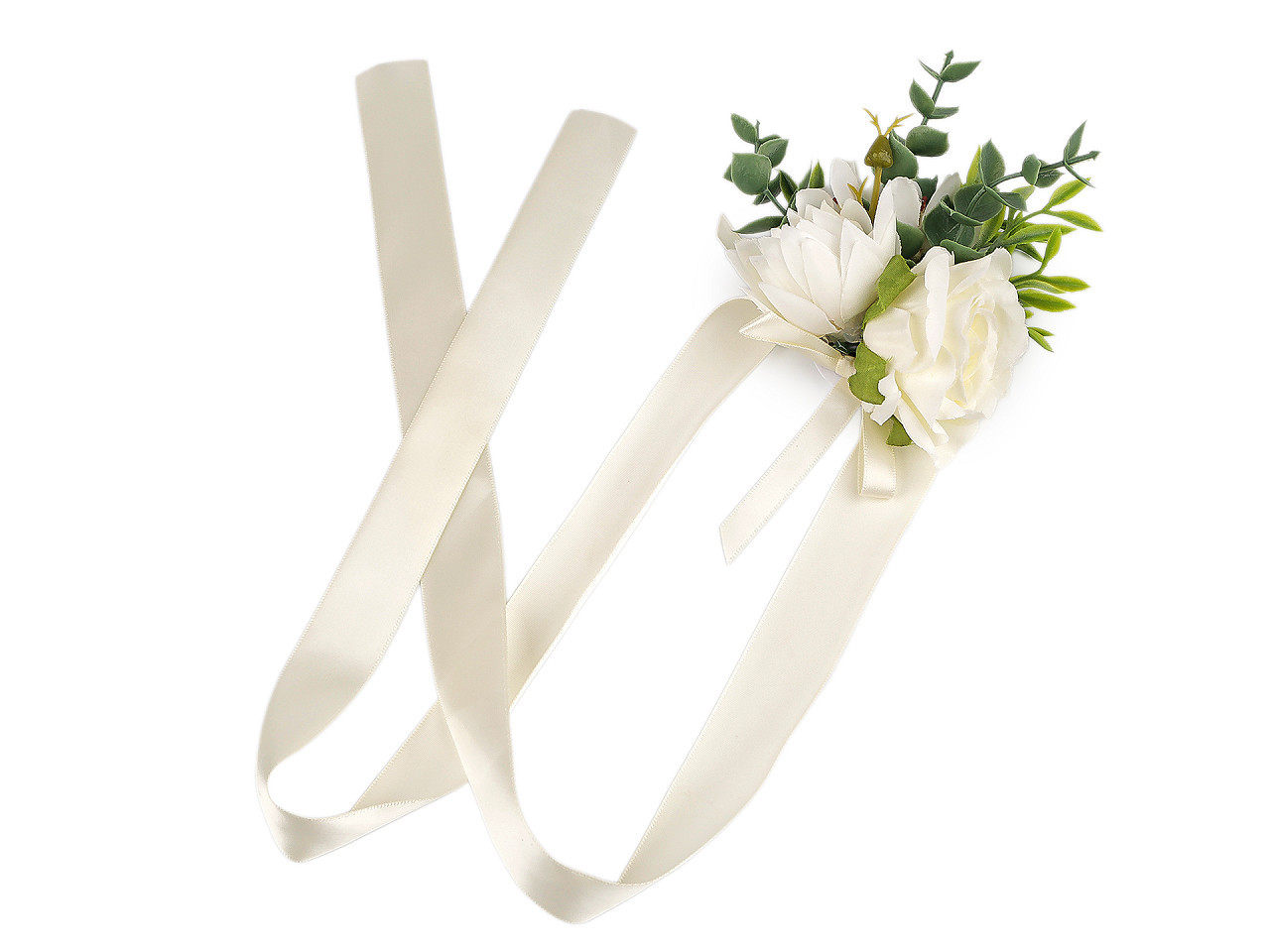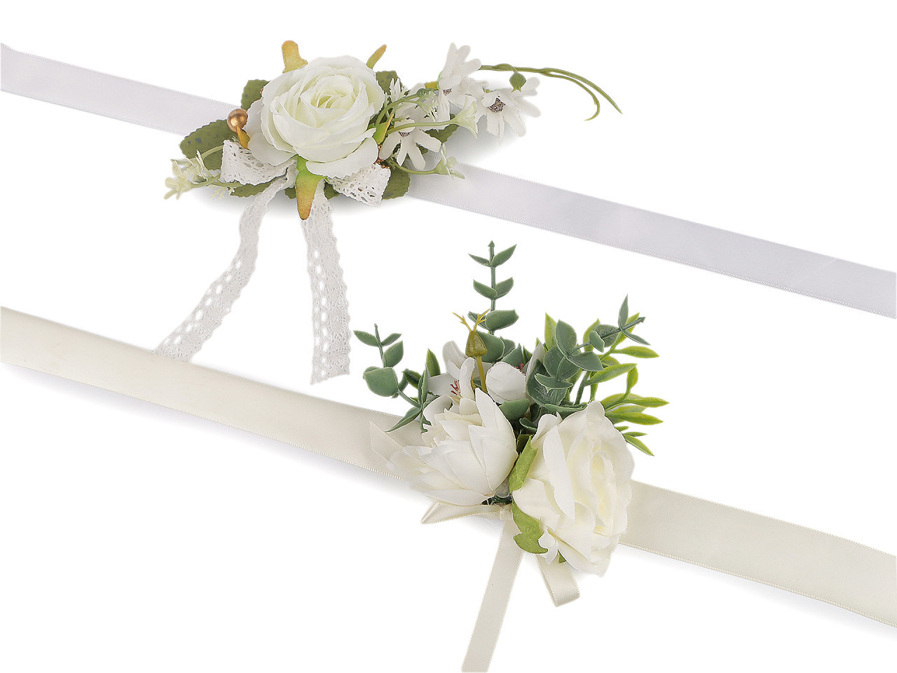 Průměr růžiček je přibližně 5 cm, celková velikost květinové ozdoby 11–15 cm, délka stuhy cca 40 cm. Tento květinový náramek je nejen stylovým šperkem, ale také nádhernou památkou na výjimečné chvíle – ať už naživo nebo zachycené na fotografiích.
